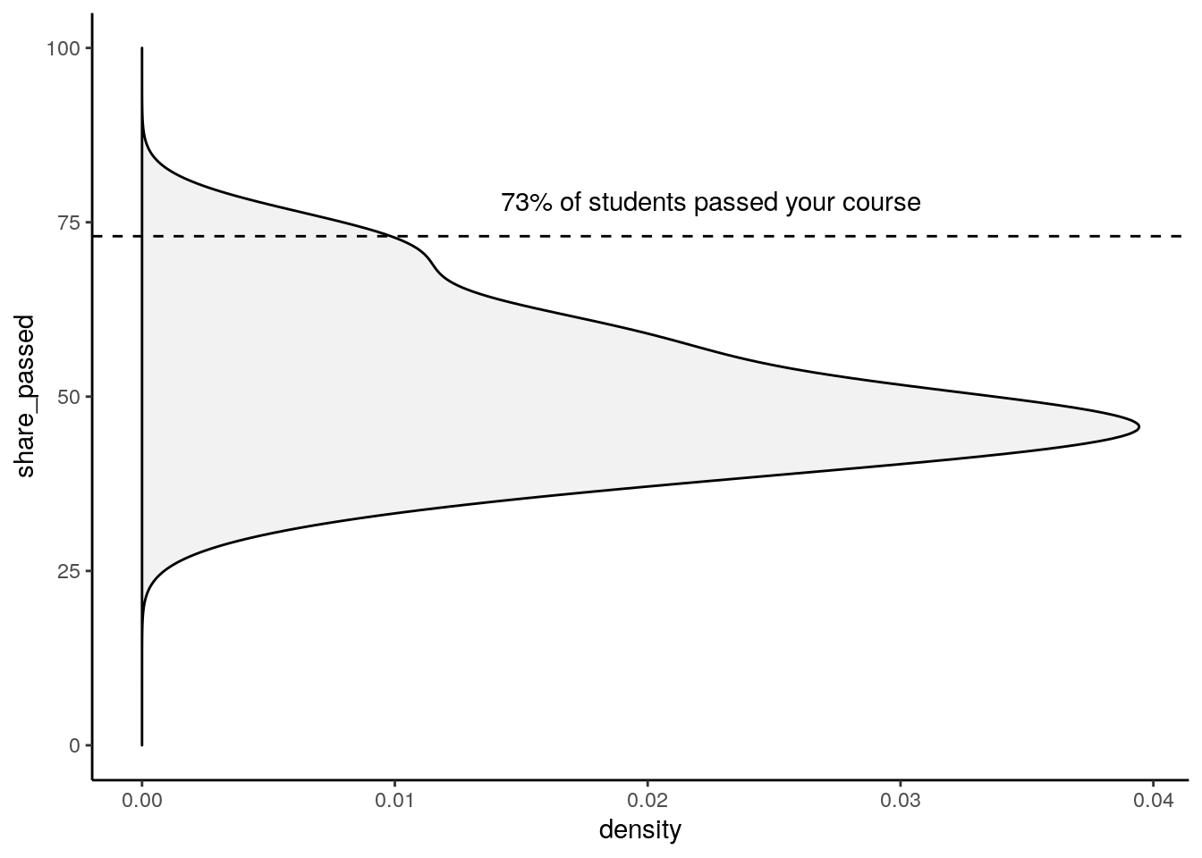 annotate("text", x = df_courses_aaa$share_passed + 5, y = 0.0225, label = str_c(df_courses_aaa$share_passed, "% of students passed your course")) +
