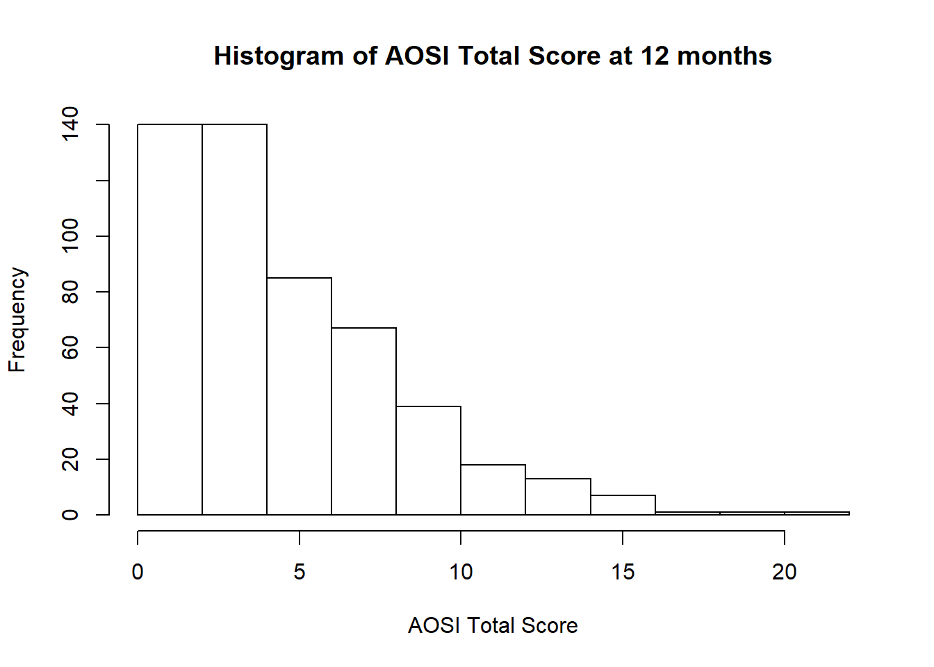 hist(data$V12.aosi.total_score_1_18, xlab = "AOSI Total Score",
