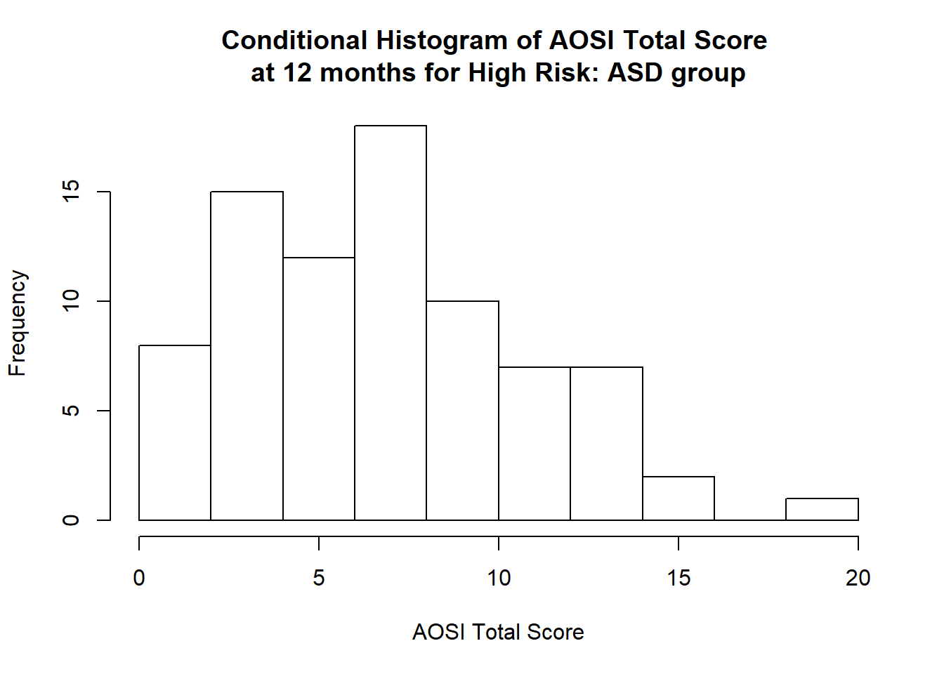 main="Conditional Histogram of AOSI Total Score \nat 12 months for High Risk: ASD group")