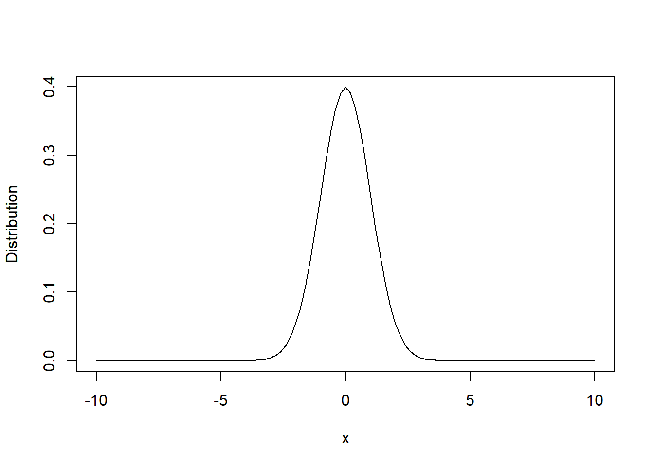 For variable \(X\), its distribution can be thought of as a function which states the probability of \(X\) equalling a specific value \(x\), for every possible \(x\). For example, if \(X\) is normal distributed, its distribution can be plotted as shown below.