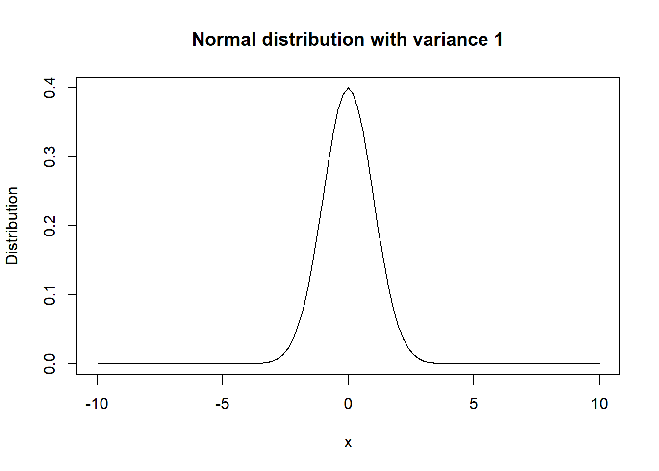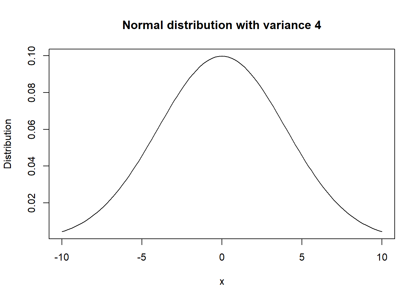 Both the mean and median can intuitively be thought of as measures of the “center” of the distribution. The variance can be thought of a measure of the “spread” of the distribution. To illustrate variance, we plot two normal distributions both with mean 0 but one with a variance of 1 and another a variance of 4. The increase in the likely range of values with a variance of 4 is quite evident, and the probabilities are more spread out. Note that the standard deviation is just the square root of the variance.