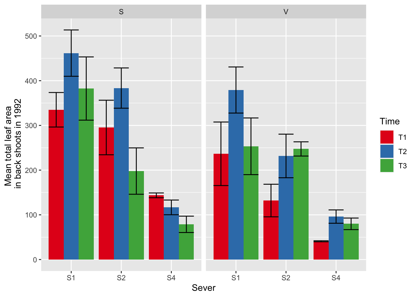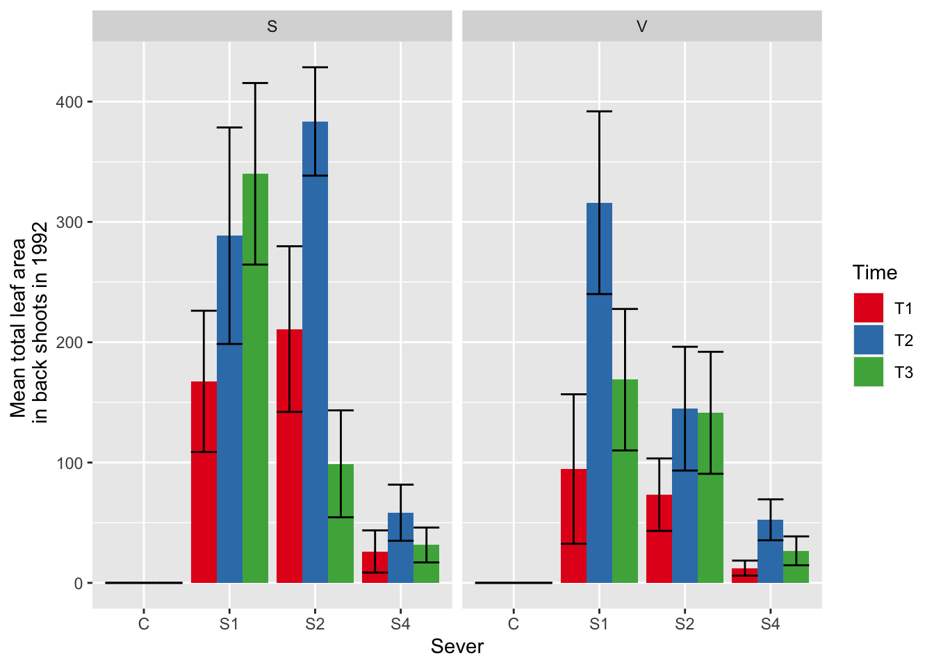 ylab("Mean total leaf area \n in back shoots in 1992") +