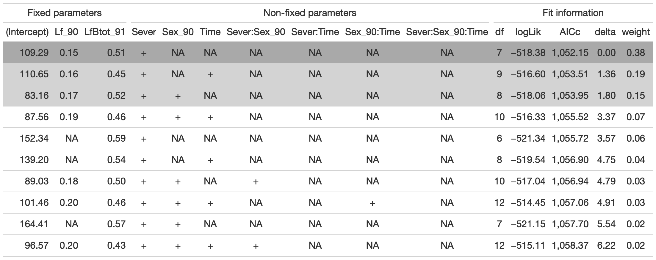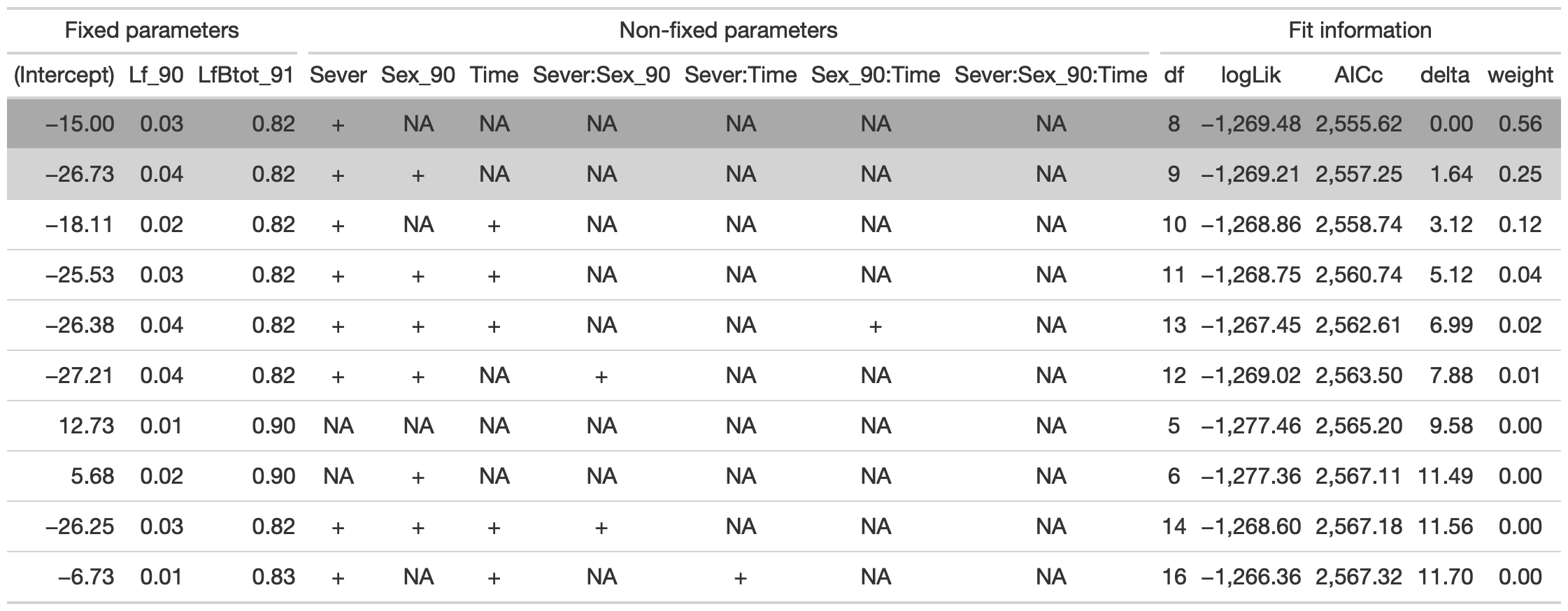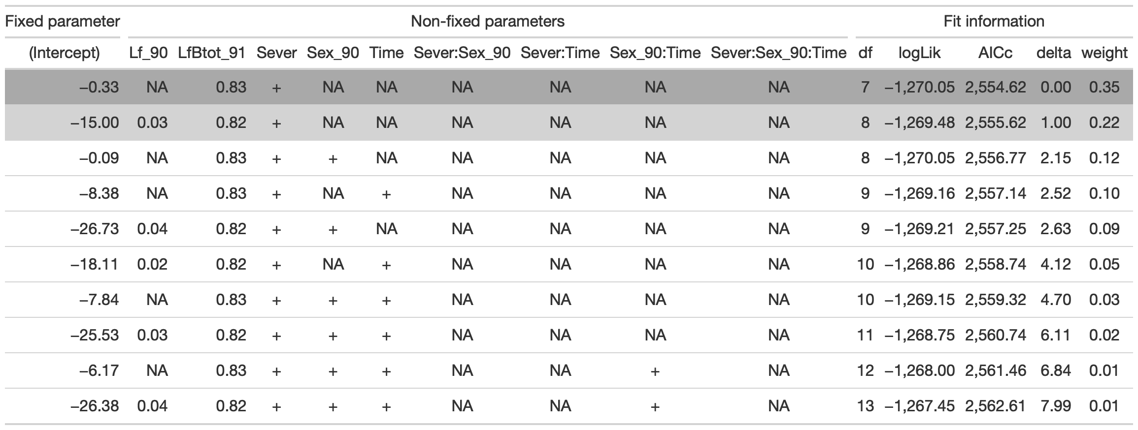 tab_spanner(label = "Non-fixed parameters", columns = vars(`(Intercept)`, Lf_90, LfBtot_91, Sever, Sex_90, Time, `Sever:Sex_90`, `Sever:Time`, `Sex_90:Time`, `Sever:Sex_90:Time`)) %>%