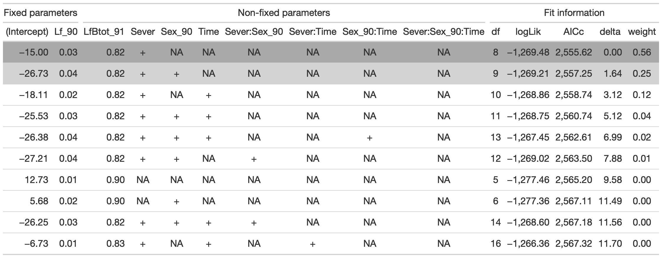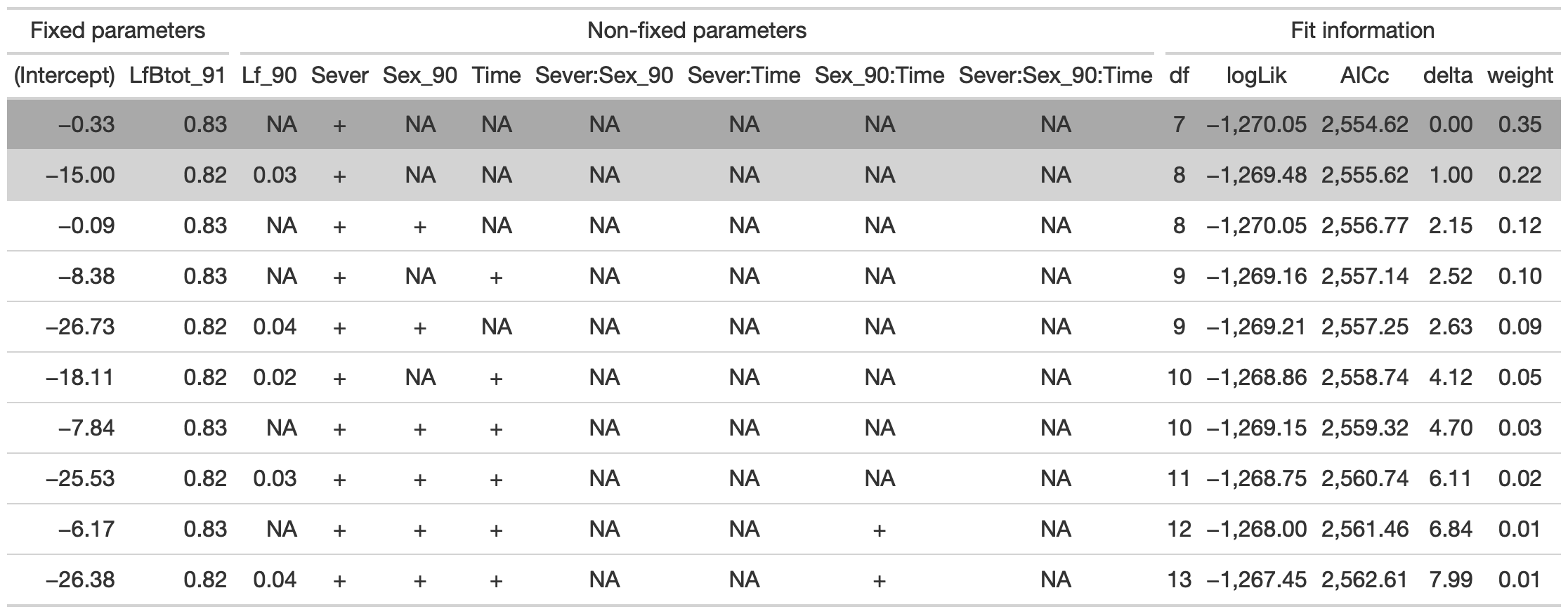 From this round of model selection, when Lf_90 and LfBtot_91 are required to be in the models that are considered, there are two models within two AICc units: (1) Lf_90, LfBtot91, and Sever (AICc 2555.6) (2) Lf_90, LFBtot91, Sever, and Sex_90 (AICc 2557.3)