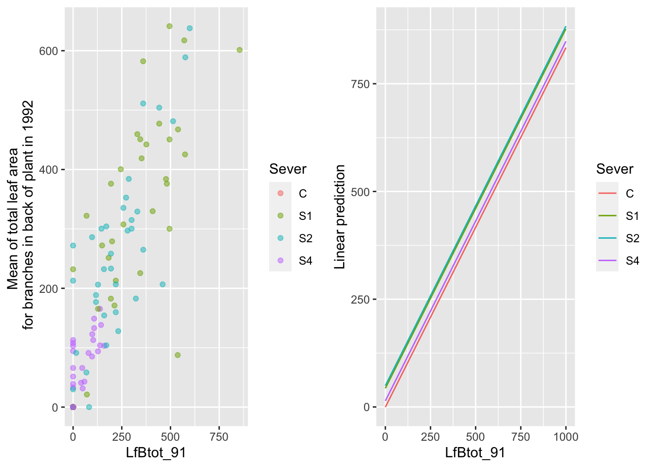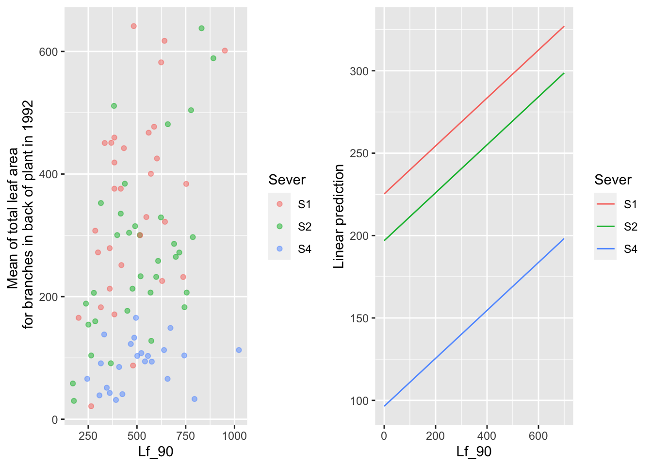g1 <- ggplot(data=mayappleData, aes(x=Lf_90, y=LftotB_92, color=Sever)) +