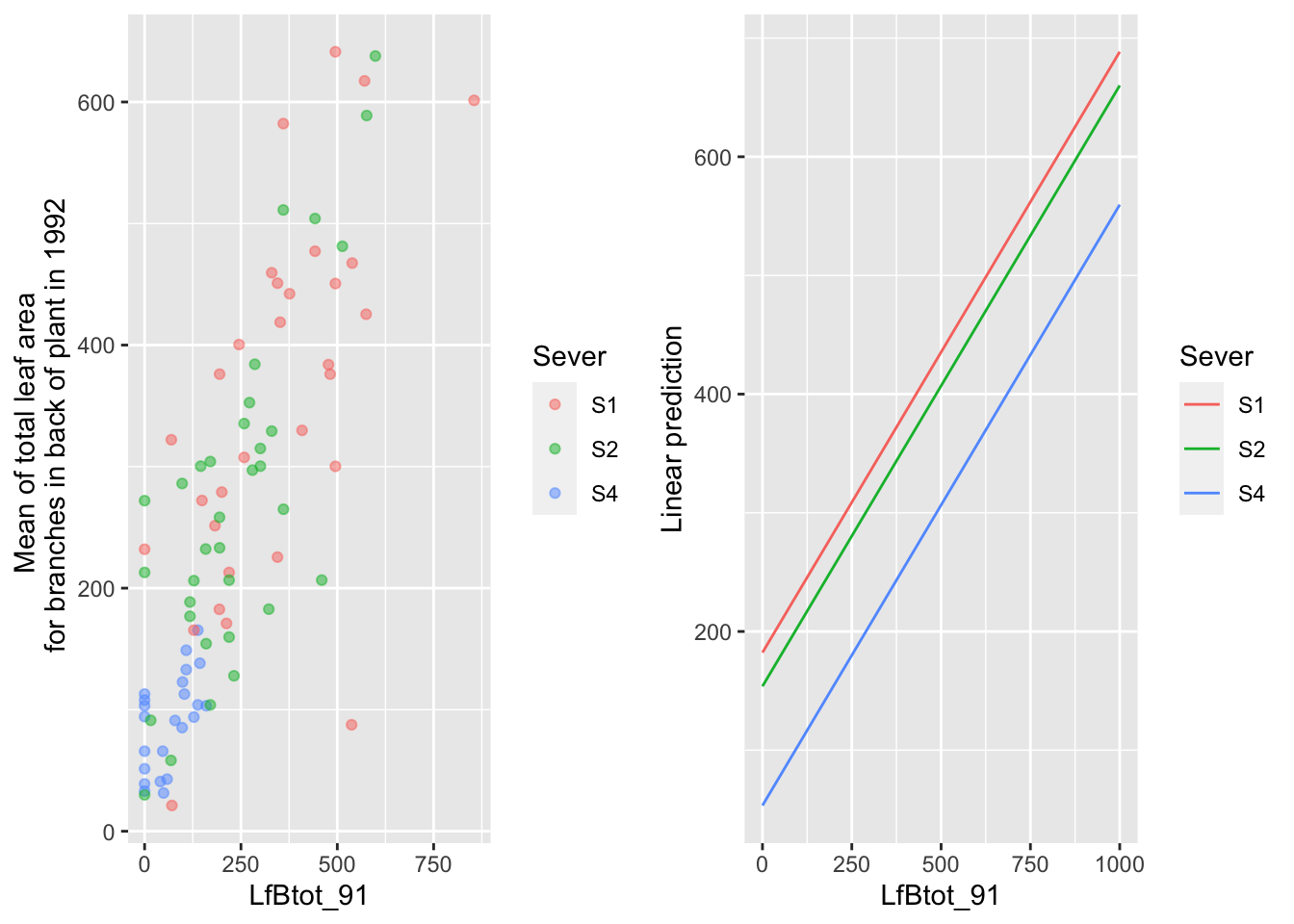 The best model contains fixed effects of Lf_90, leaf area in 1991, and Sever.