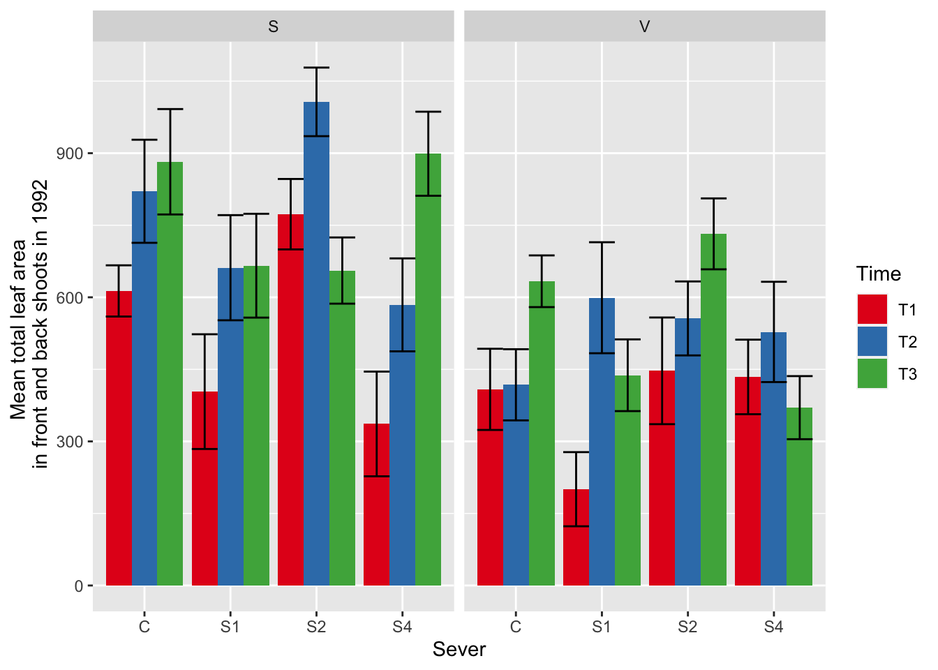 ylab("Mean total leaf area \n in front and back shoots in 1992")