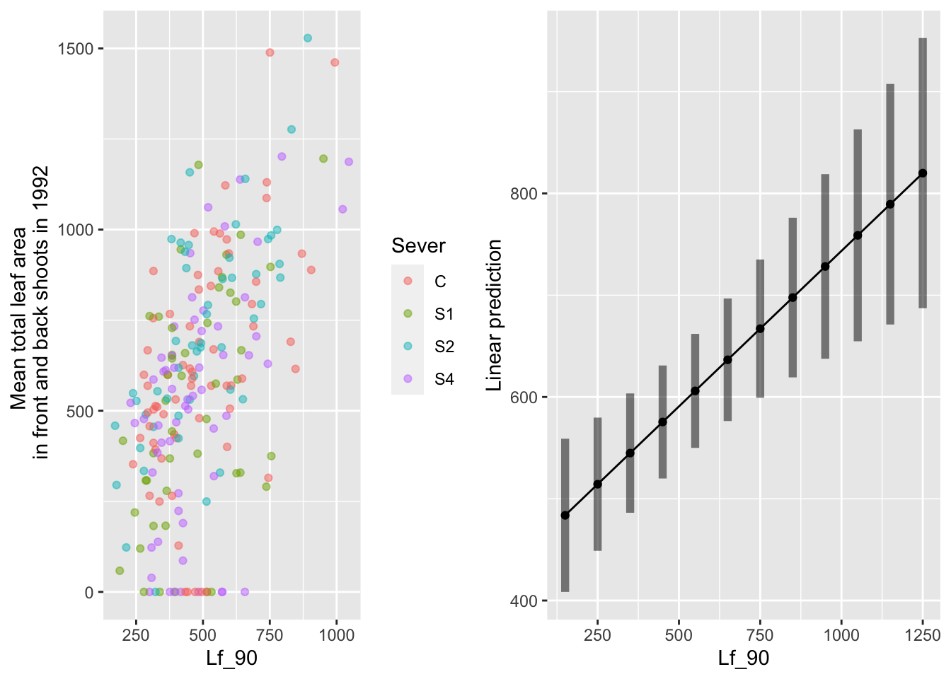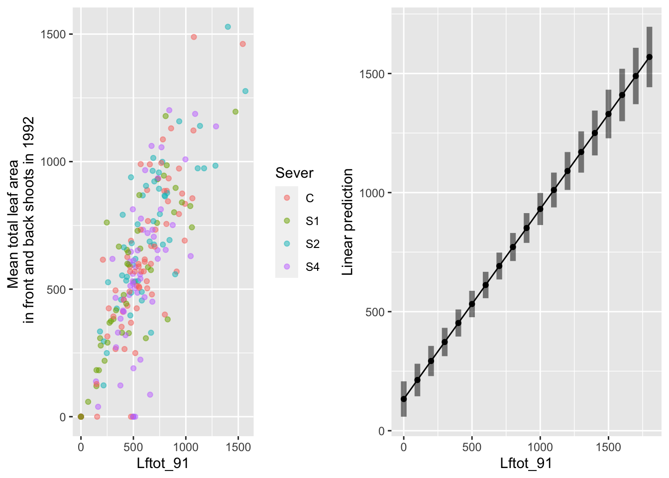The simplest and best model here includes fixed effects of total leaf area in 1991 and leaf area in 1990.