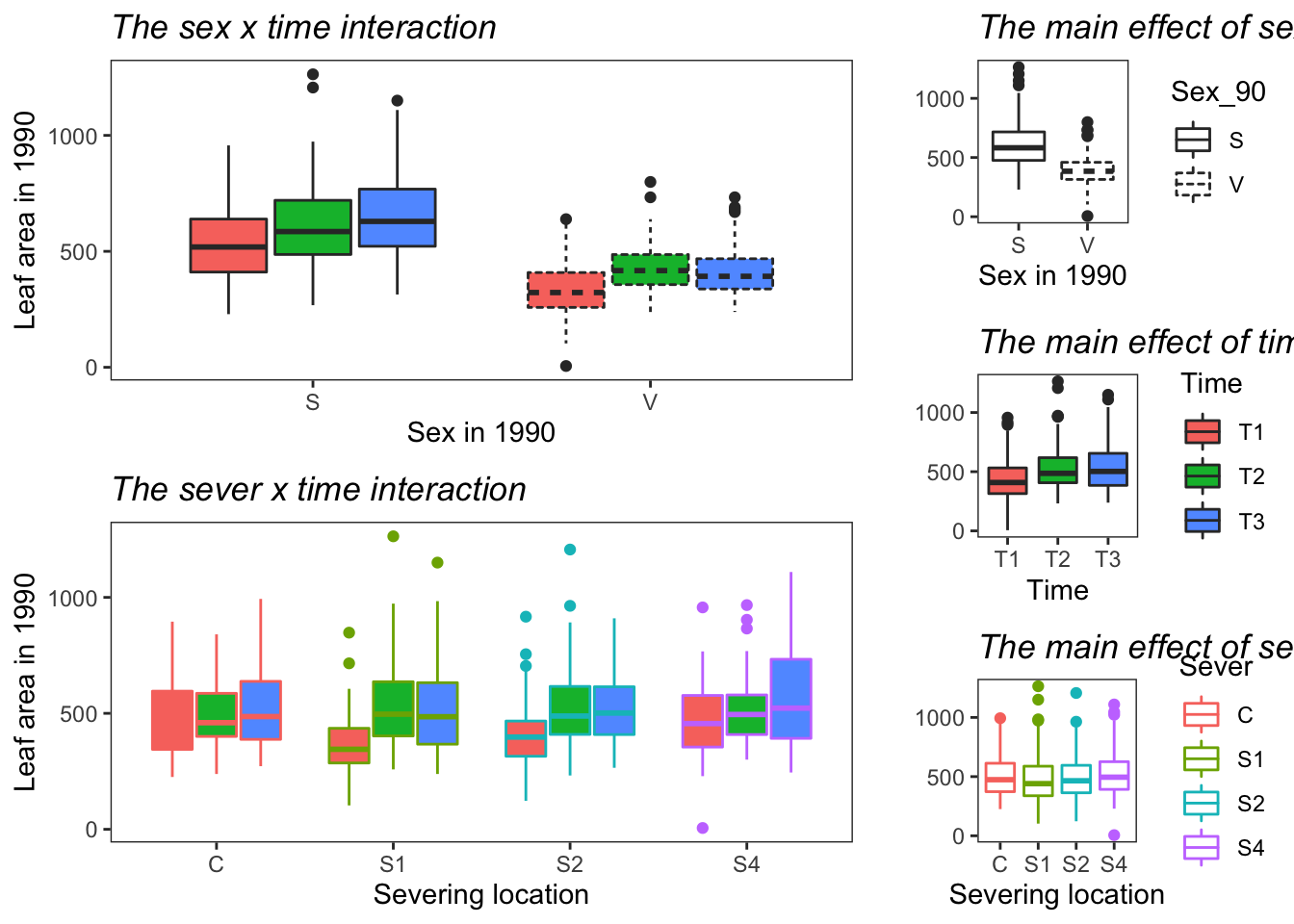 We ran a linear mixed-effects model using lmer. The response was leaf area in 1990. The fixed-effects were sex in 90, severing position, and severing time, and all possible interactions. The random-effects were colony.