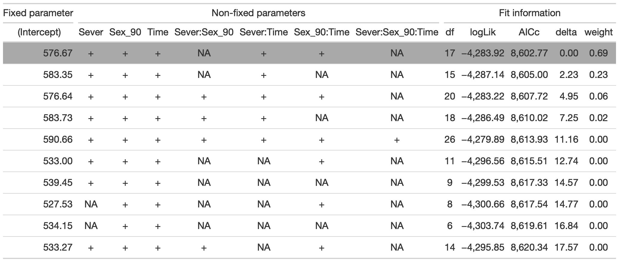 tab_spanner(label = "Non-fixed parameters", columns = vars(`(Intercept)`, Sever, Sex_90, Time, `Sever:Sex_90`, `Sever:Time`, `Sex_90:Time`, `Sever:Sex_90:Time`)) %>%
