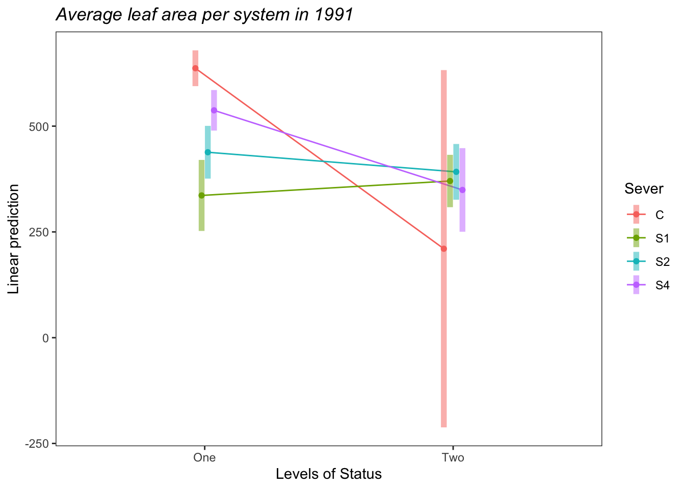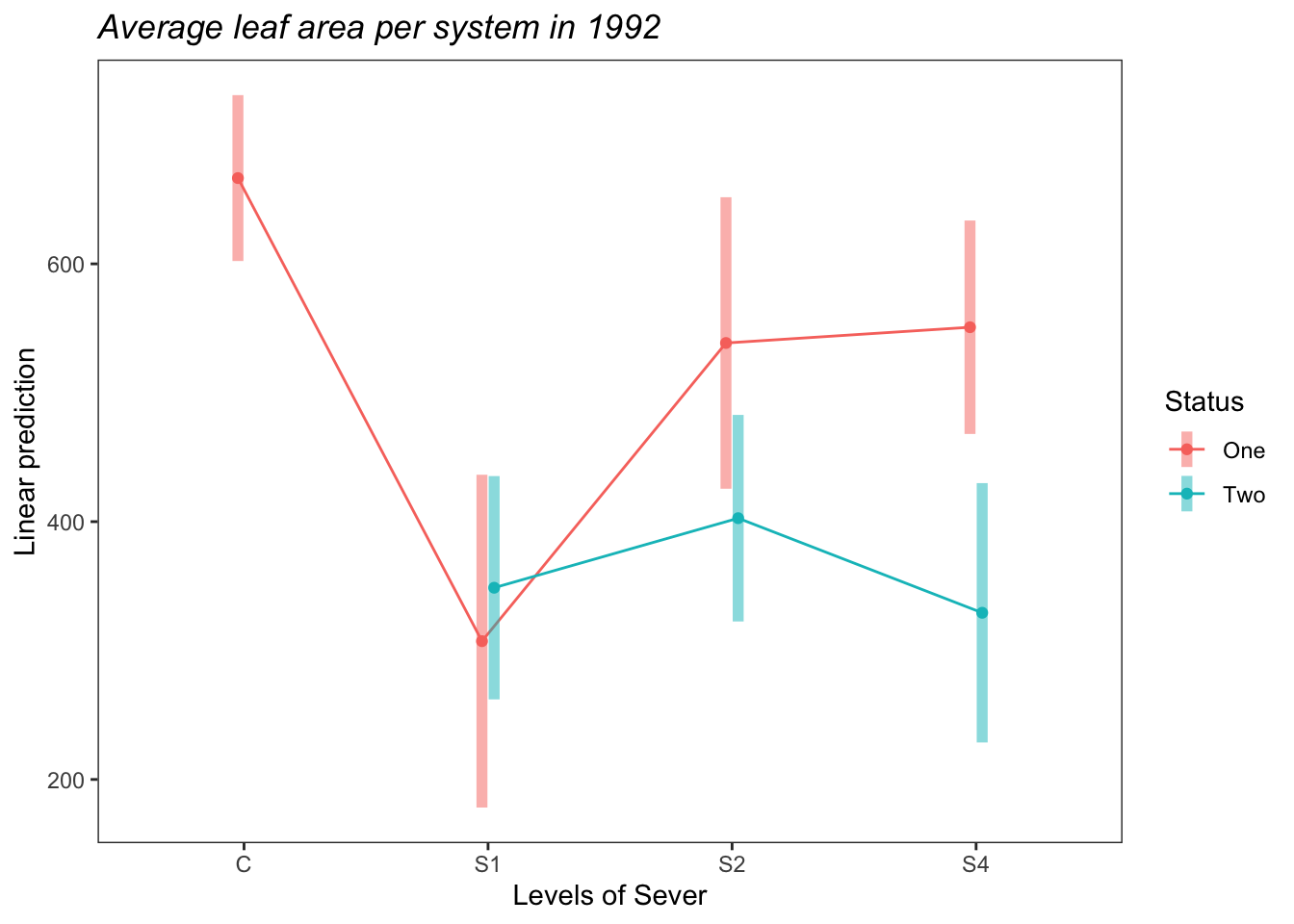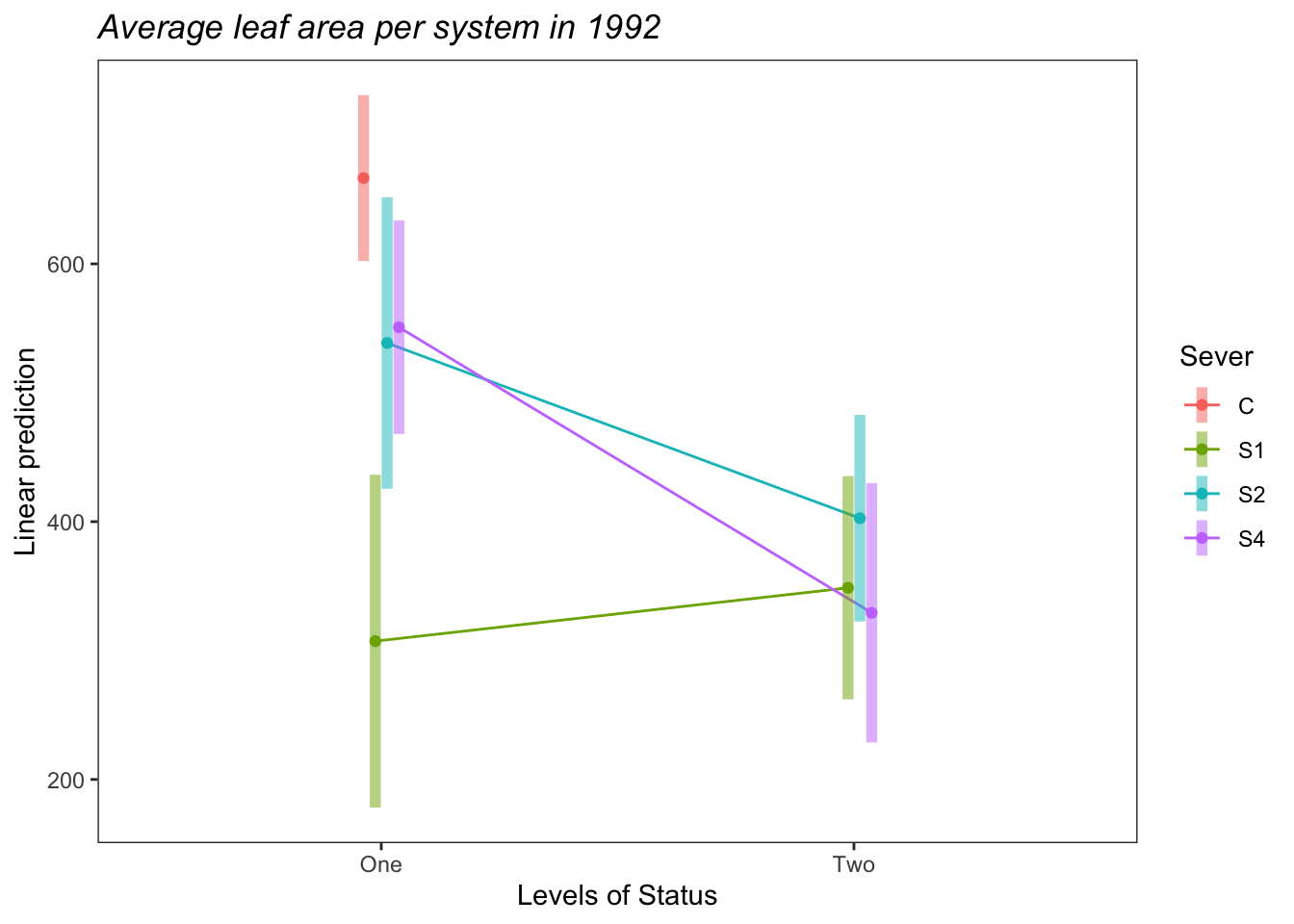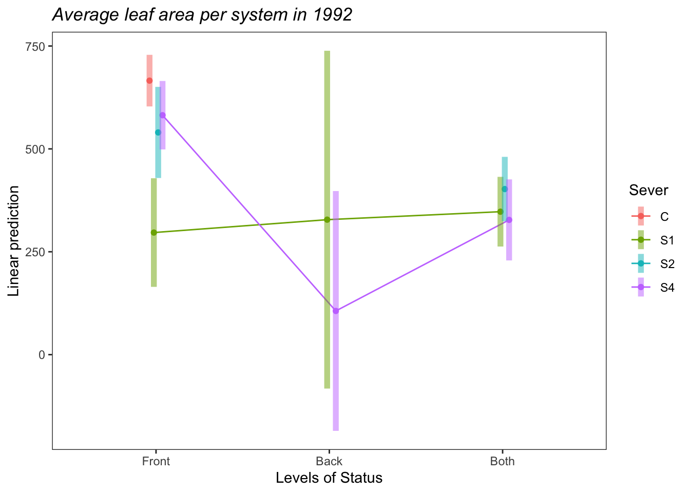 d<-emmip(s92mod, Sever~Status ,CIs = TRUE)+ ggtitle("Average leaf area per system in 1992")+