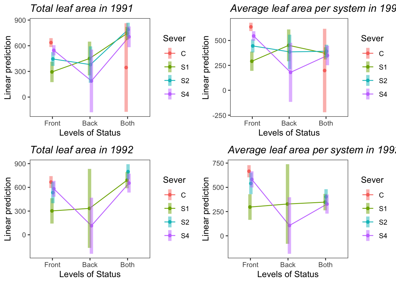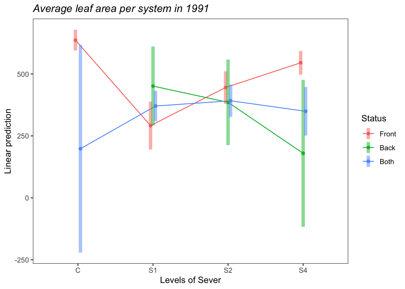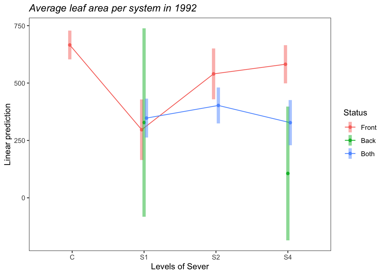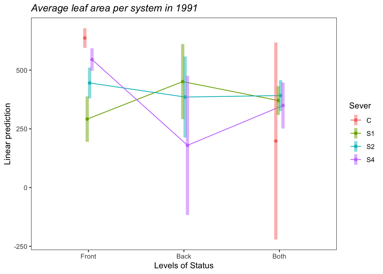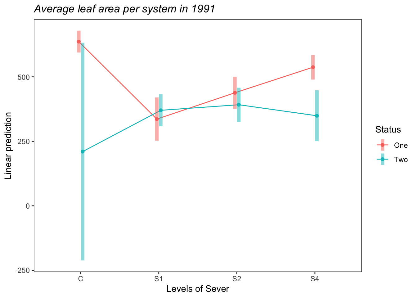 d<-emmip(s92mod, Sever~Status ,CIs = TRUE)+ ggtitle("Average leaf area per system in 1992")+