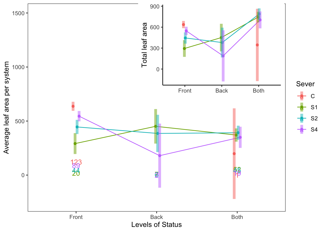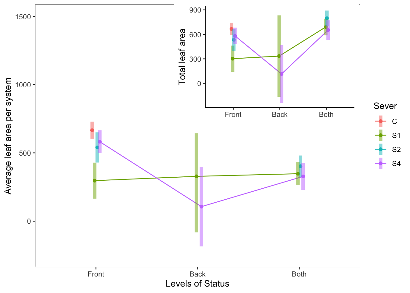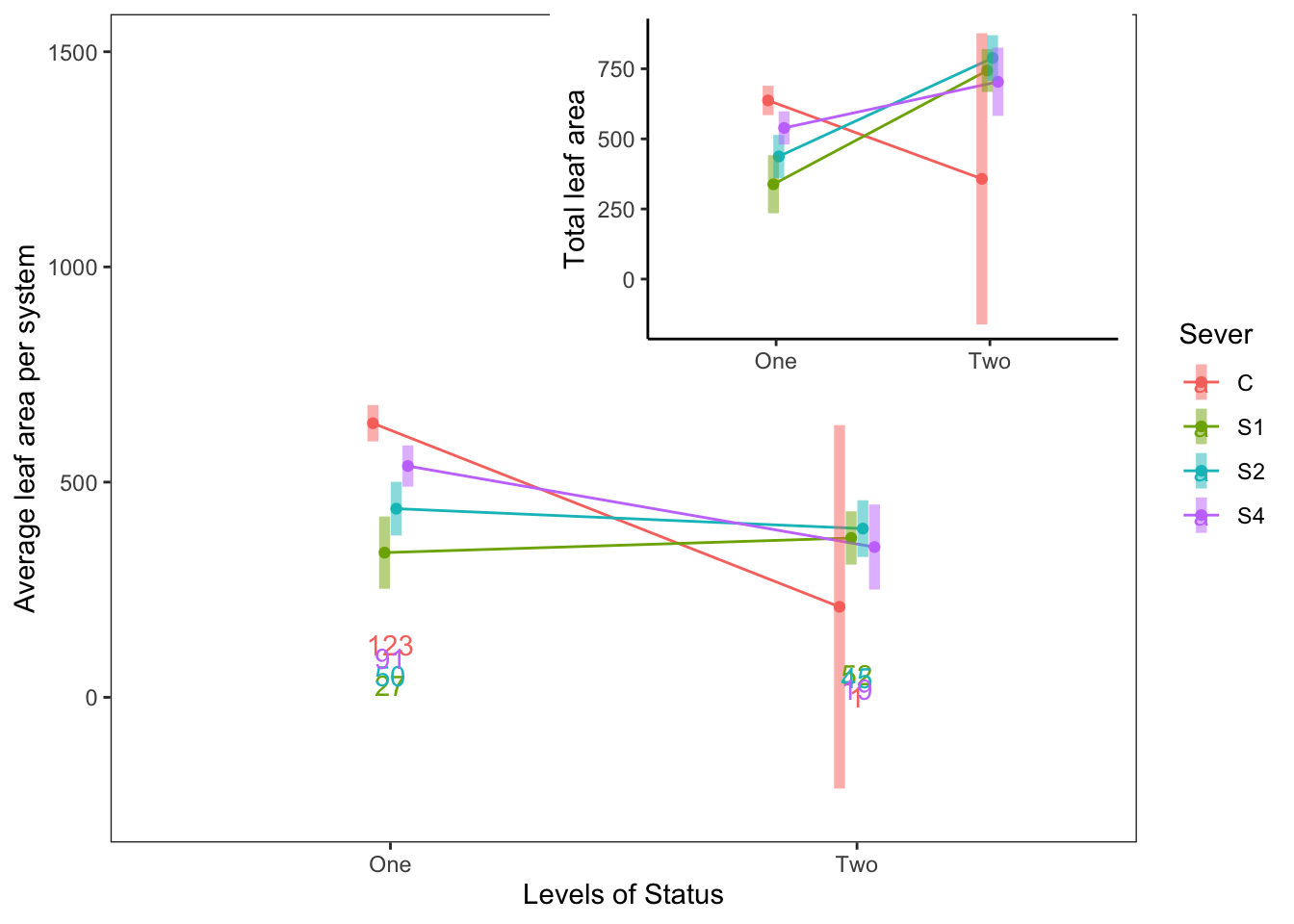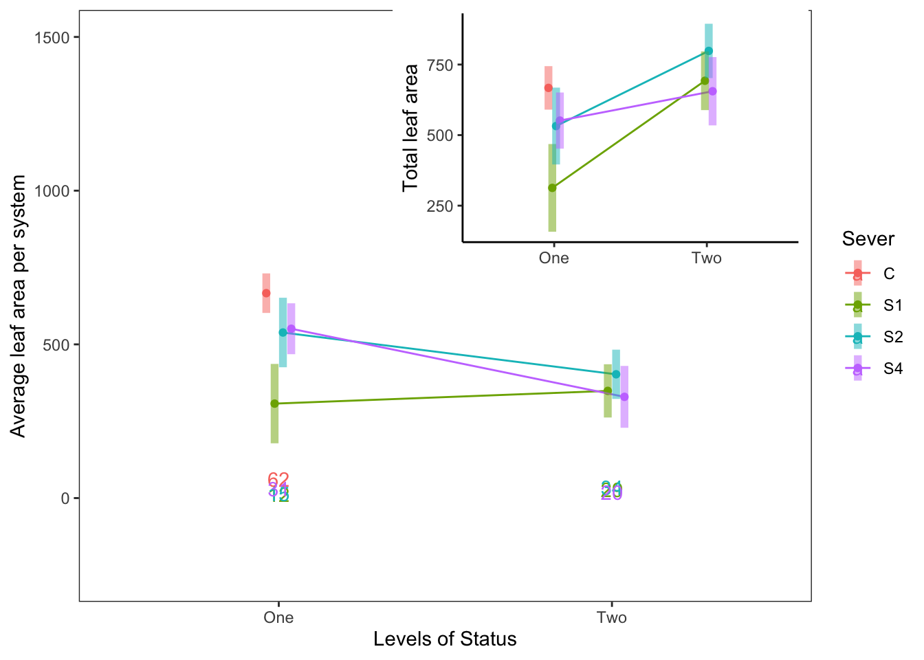 d<-emmip(s92mod, Sever~Status ,CIs = TRUE)+ ggtitle("Average leaf area per system in 1992")+