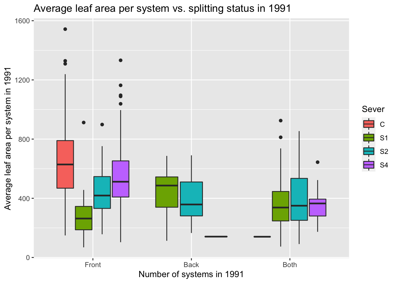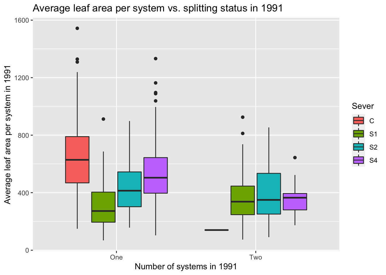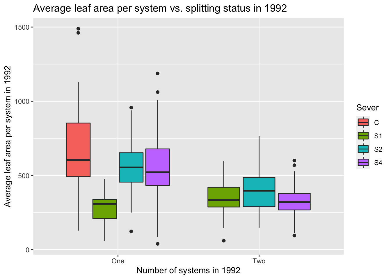 - how does severing affect the size of plants that produce 0, 1, or 2 systems? Approach: modeling total leaf area as a function of severing (C, S1, S2, S4), number of systems (0, 1, 2), and their interaction. I know previously we had been talking about breaking the controls out as a separate group. However, I think if we do it this way, it will be more parallel with the contingency table analysis, and lets us test for that interaction, because now our controls won’t be synonymous with both a treatment and a number of systems.