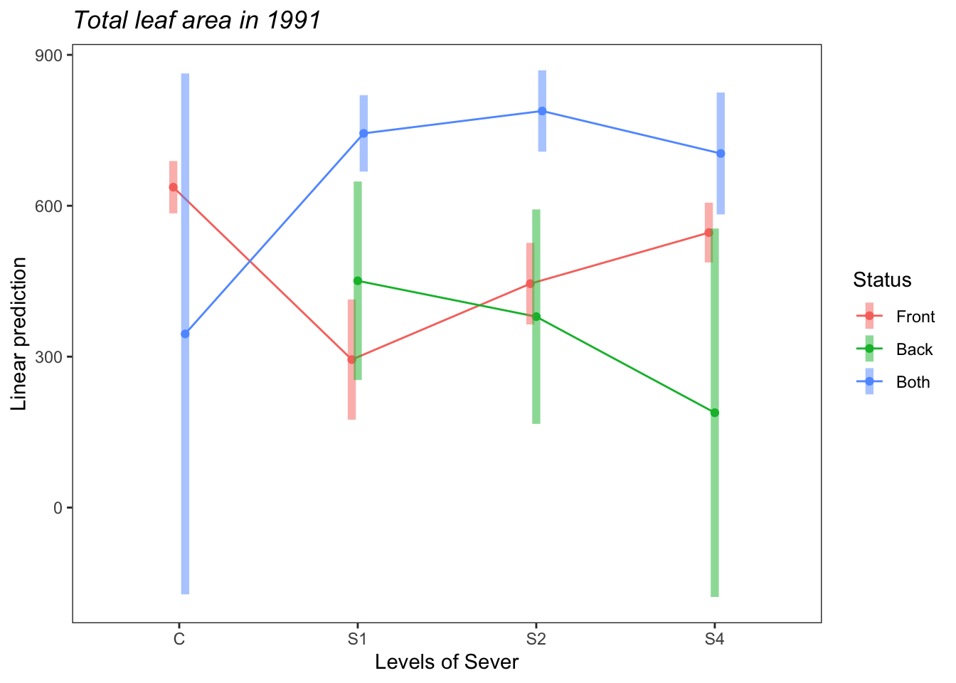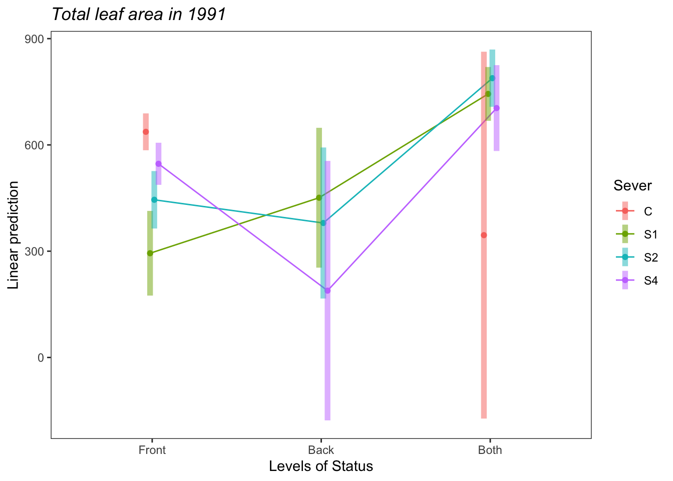 c<-emmip(s92mod, ~Sever~Status ,CIs = TRUE)+ ggtitle("Total leaf area in 1992")+