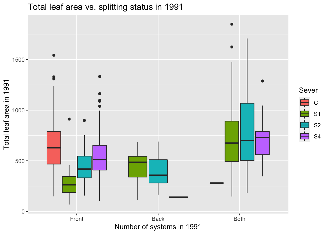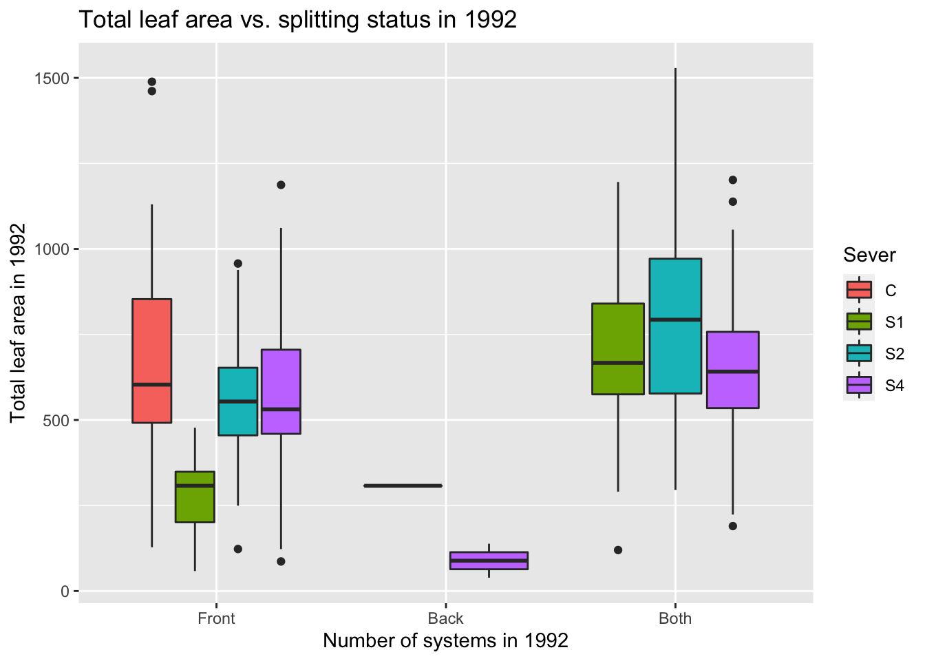 So, continuing to think this through, maybe for this portion, comparisons that would be interesting are: control vs. any type of severing for front, back, and both (in reality, this will probably only end up working for the front), and then within s1, s2, and s4, are there differences between front, back, or both? I recognize the first piece is somewhat repetitive with previous analyses of front leaf area, but I think it makes sense to be to present it that way in this context.