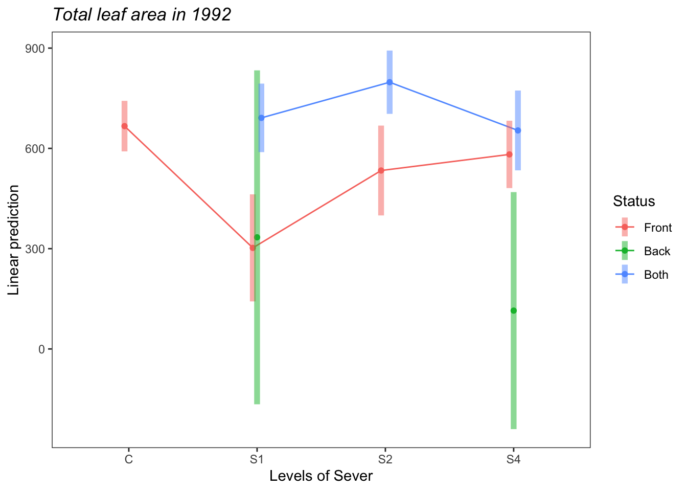 emmip(s92mod, ~Status~Sever ,CIs = TRUE)+ ggtitle("Total leaf area in 1992")+