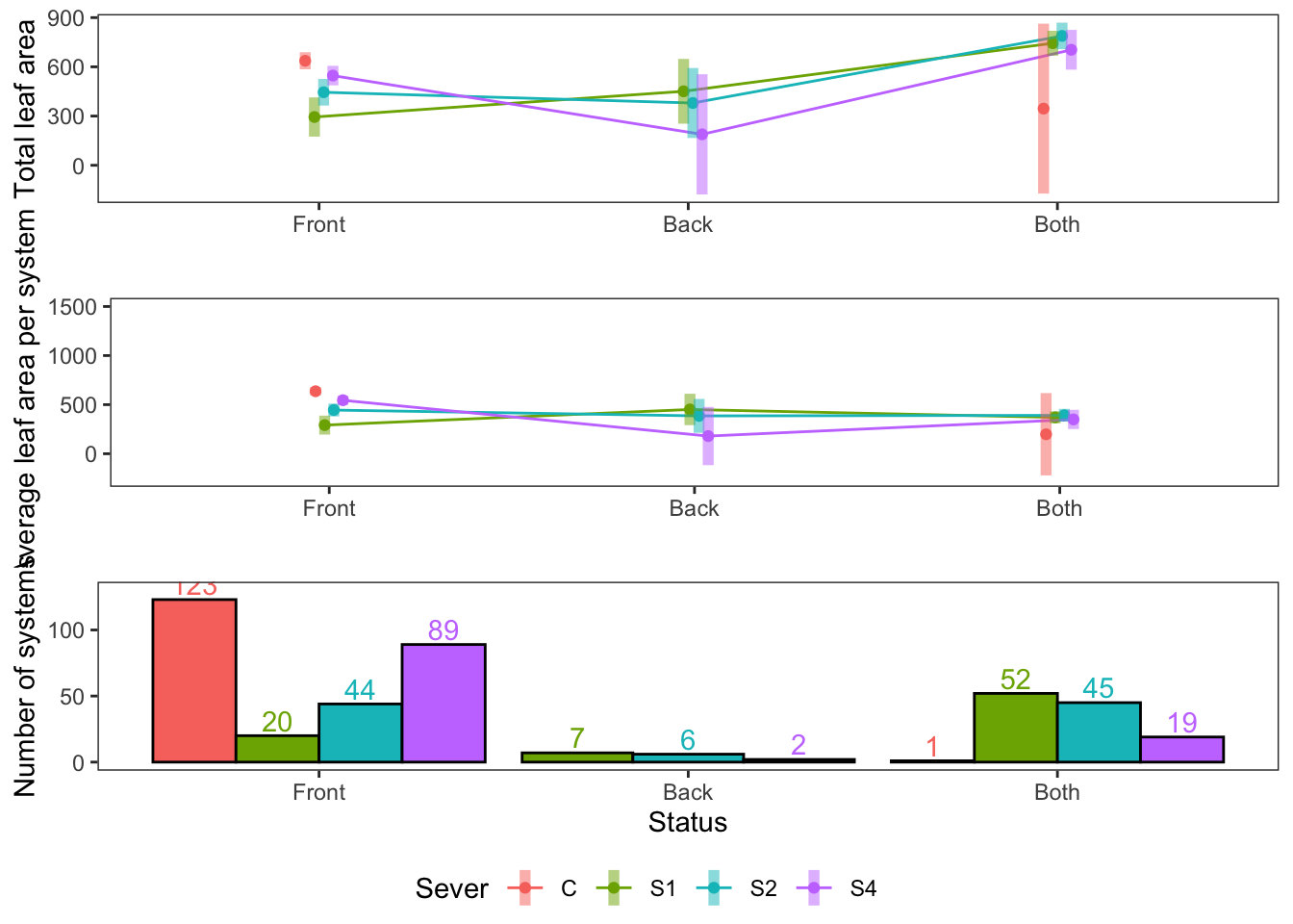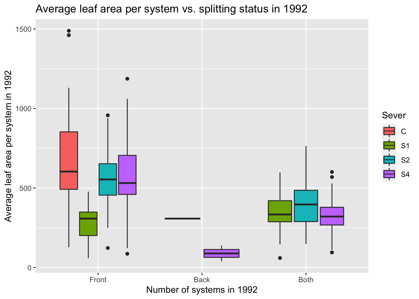 KE thoughts July 14: For this piece, I think working with the zero systems doesn’t make a lot of sense, because they have zero leaf area by definition, and so contrasts with the other categories aren’t super meaningful in general, and also do not vary across the severing treatments, which is the point of this. In the contingency table analysis described above, we can look at how the distribution of the zero systems may vary across the severing treatments. I think the comparisons that are valuable are, within a severing treatment, do systems have different total or average leaf areas when they have a front vs. a back vs. both system components? Putting aside the control treatment, I think for the three types of severing, we should definitely be able to compare front to both. Comparisons involving the back are likely to be non-significant because of the small sample sizes.