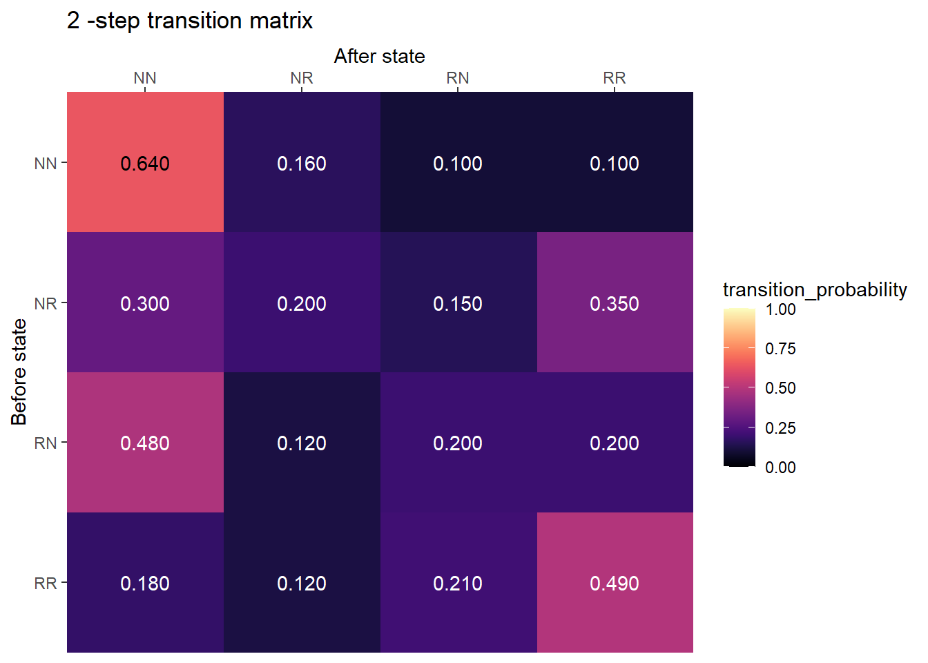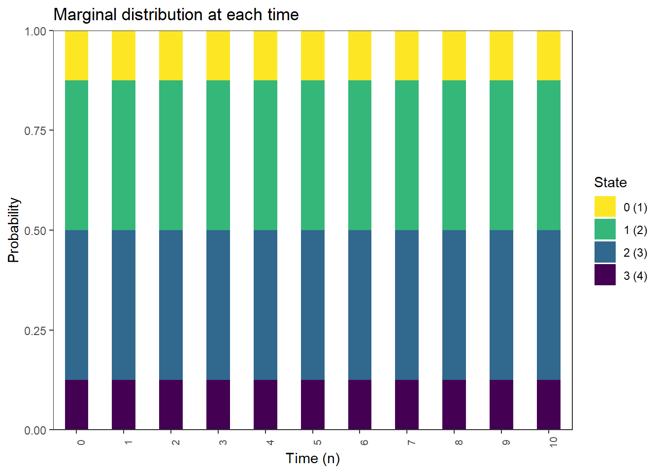 pi_0 %*% (P %^% 2) [,1] [,2] [,3] [,4]