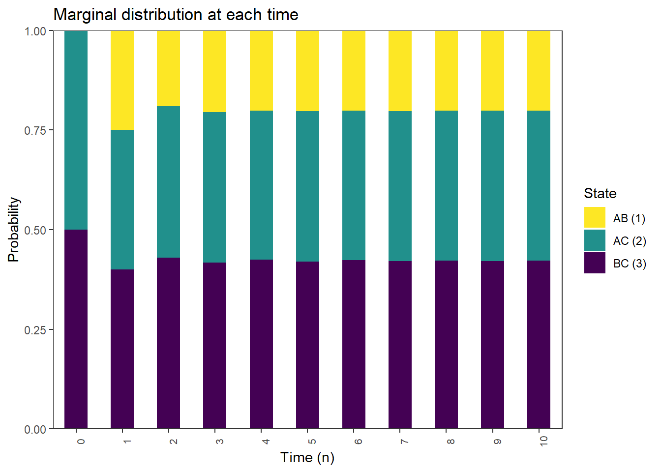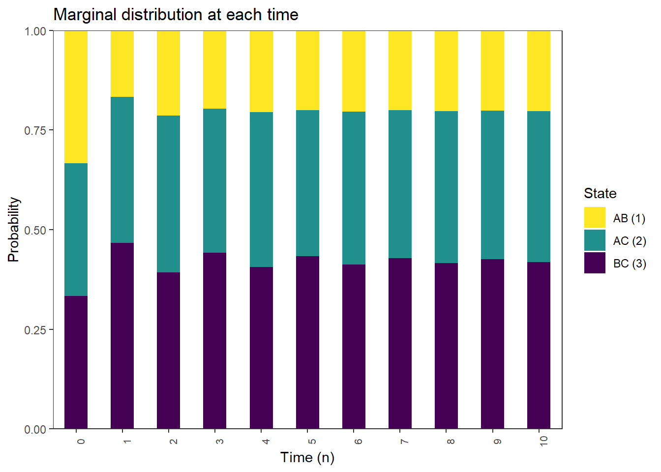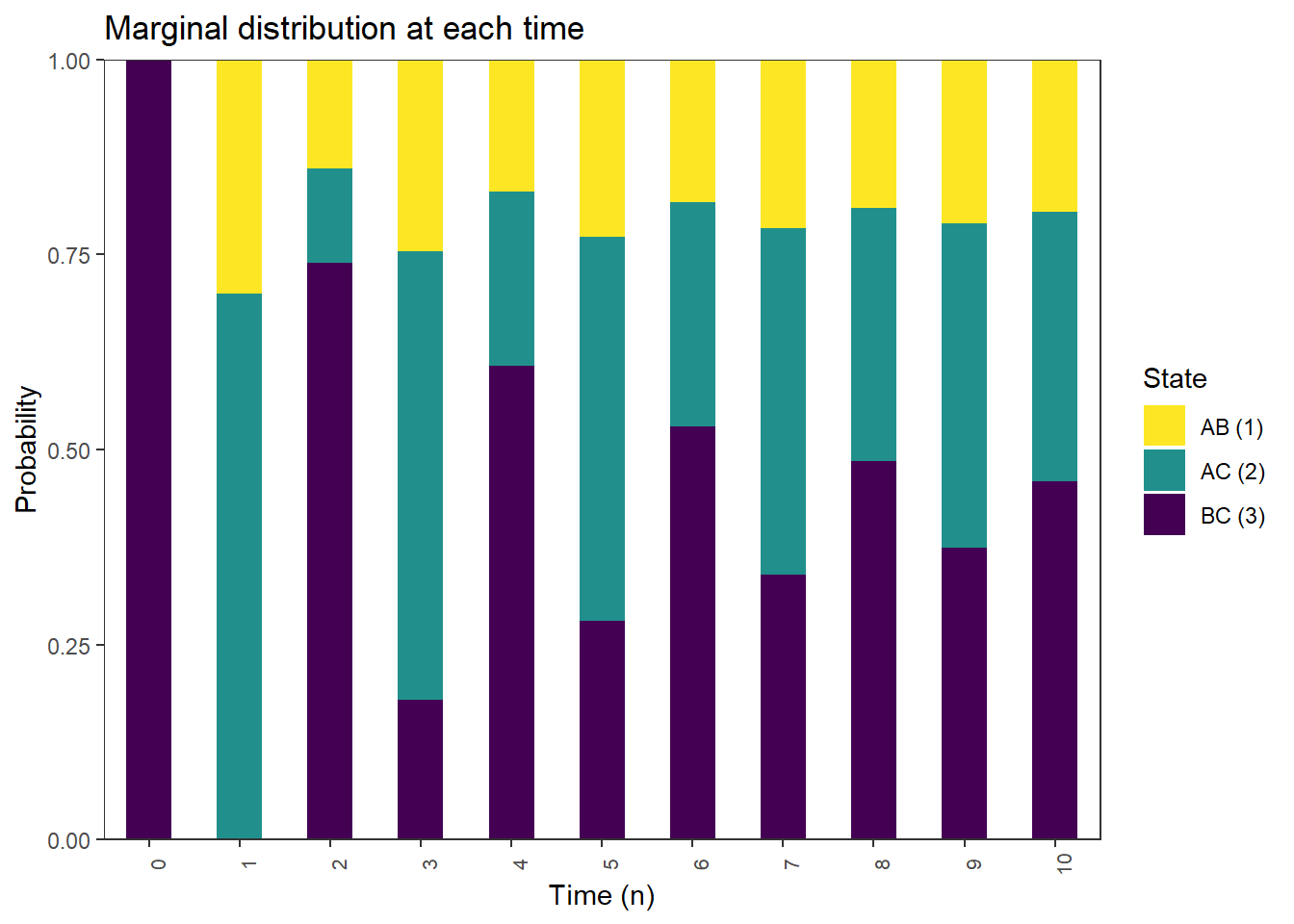 plot_DTMC_marginal_bars(pi_0, P, state_names, last_time = 10)