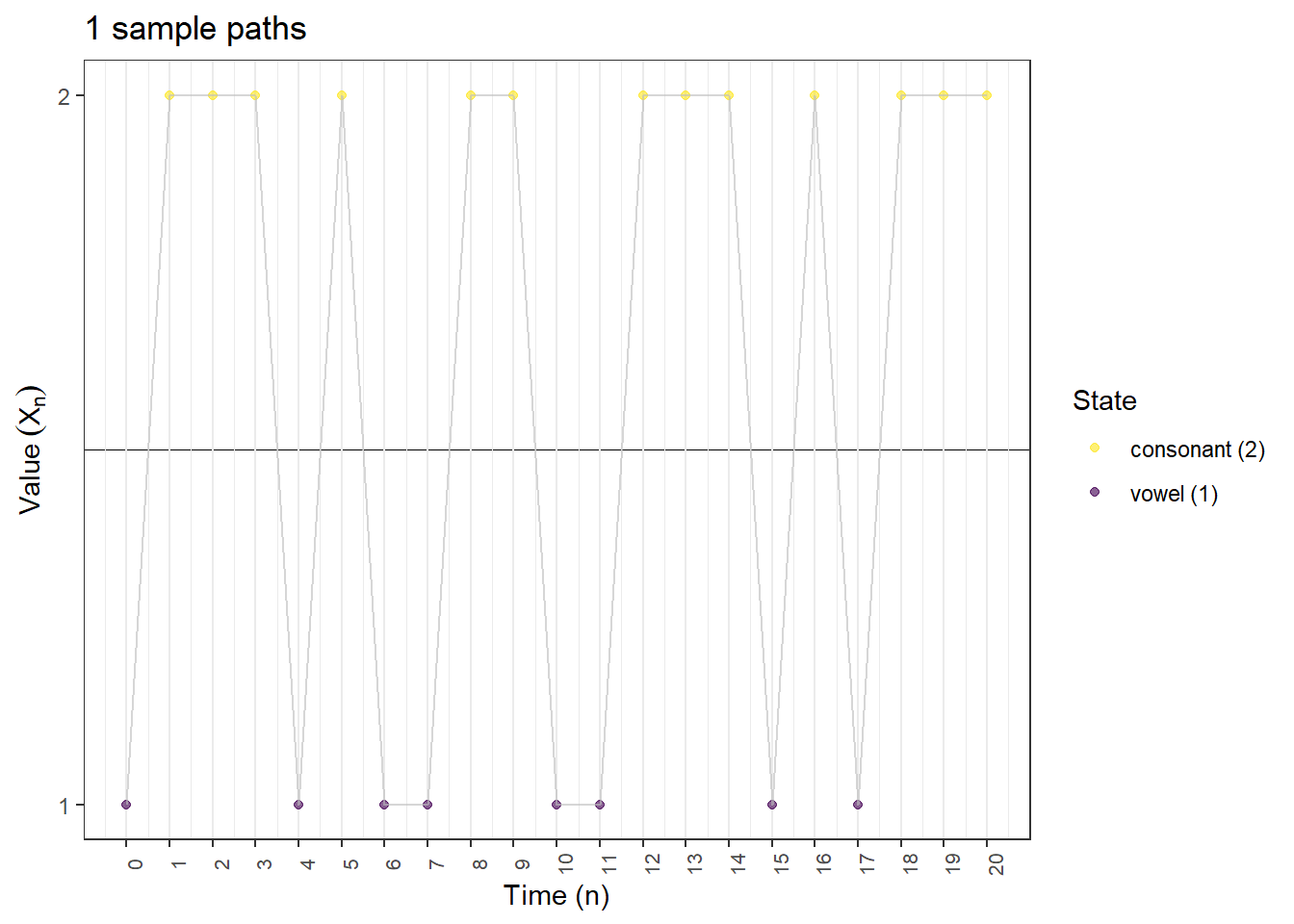 X[n] = sample(states, 1, replace = TRUE, prob = transition_matrix[X[n-1], ])