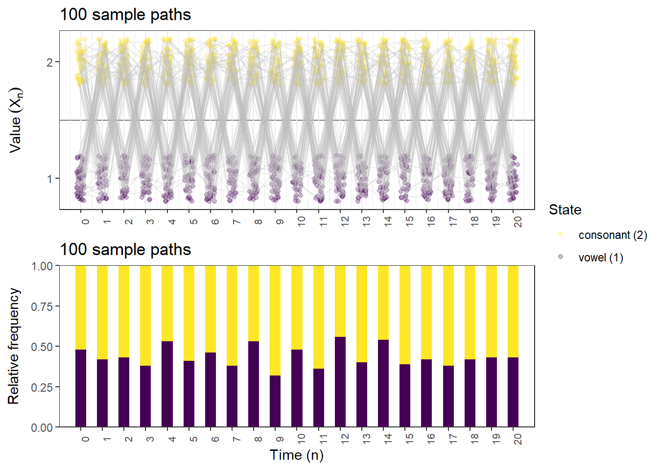 plot_DTMC_simulated_paths_and_marginals <- function(initial_distribution, transition_matrix, state_names, last_time, n_paths) {