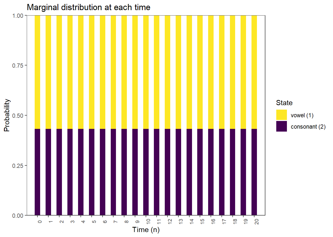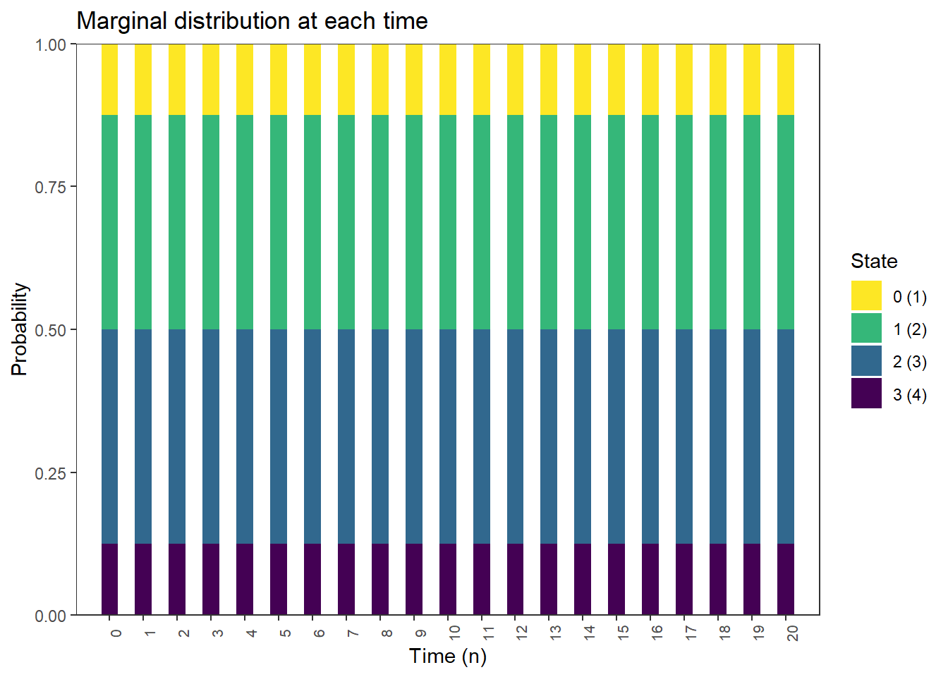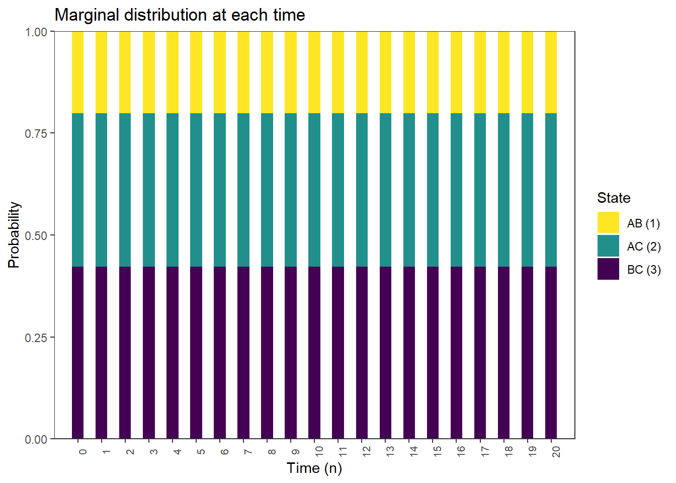 pi_0 = c(0.432, 0.568)Marginal distributions if initial distribution is stationary distribution