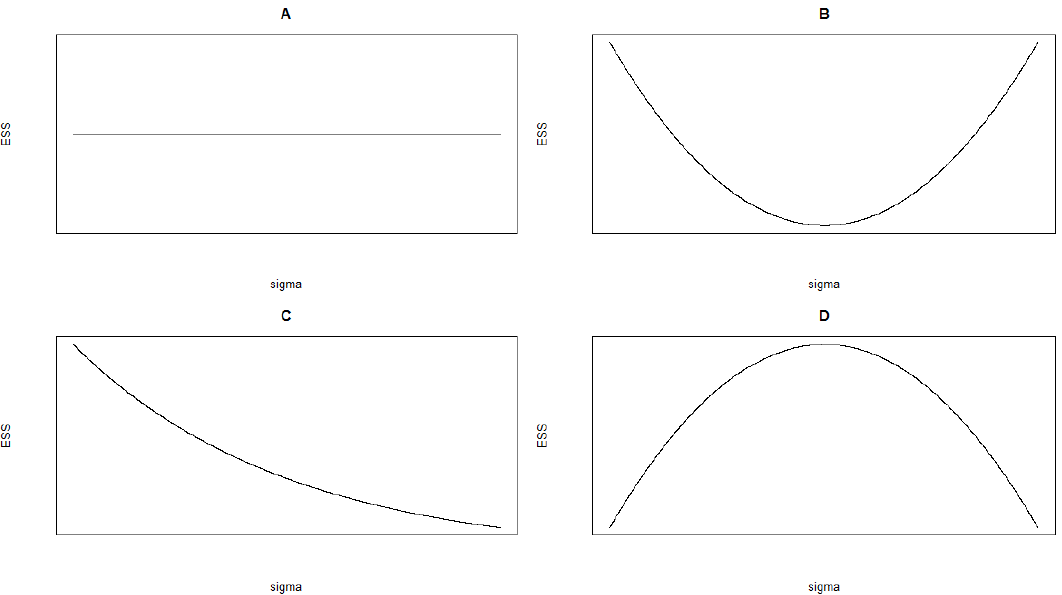 - Consider a Metropolis algorithm where given current state \(x\), the proposed state is generated from a \(N(x, \sigma)\) distribution. Suppose you run the algorithm for many different values of \(\sigma\) and compute the effective sample size (ESS) for each. All other thing being equal, which one of the following plots best depicts the relationship between \(\sigma\) and ESS? Choose one and briefly explain your reasoning.