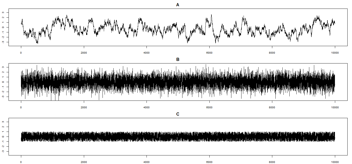 - The following are trace plots from three different MCMC algorithms for simulating values from a N(0, 1) posterior distribution. That is, the target distribution is the N(0, 1) distribution. Each algorithm has been run for 10000 steps after a warm up (burn in) period of 1000 steps. Note: all plots are on the same scale; pay attention to the scale. Use the plots to answer the following questions. For each prompt choose a plot and explain your reasoning.