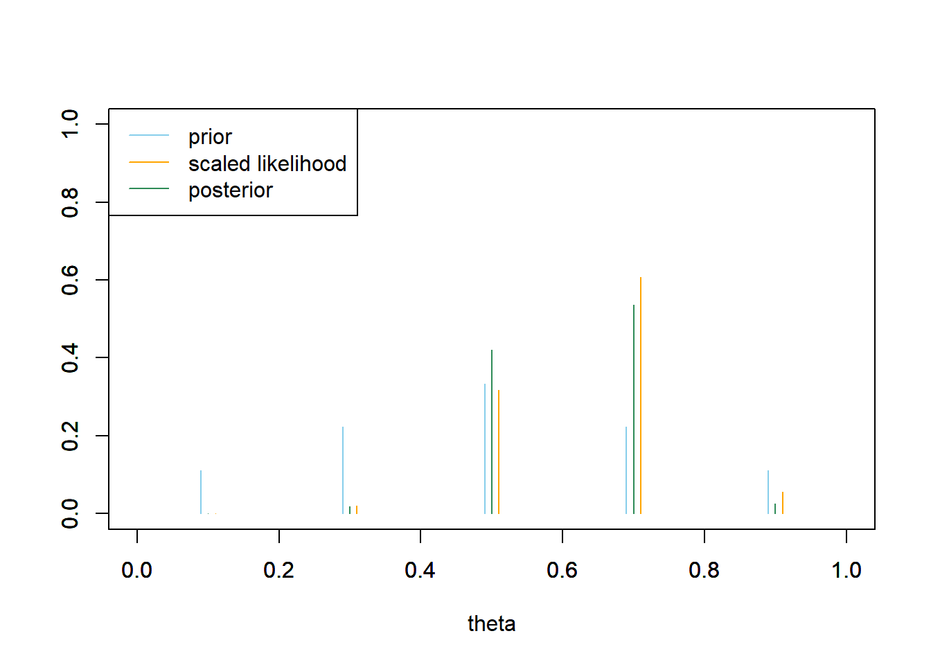 theta = seq(0.1, 0.9, 0.2) # prior prior = rep(1, length(theta)) prior = prior / sum(prior) # data n = 12 # sample size y = 8 # sample count of success # likelihood, using binomial likelihood = dbinom(y, n, theta) # function of theta # posterior product = likelihood * prior posterior = product / sum(product) # bayes table bayes_table = data.frame(theta, prior, likelihood, product, posterior) kable(bayes_table %>% adorn_totals("row"), digits = 4, align = 'r')theta prior likelihood product posterior 0.1 0.2 0.0000 0.0000 0.0000 0.3 0.2 0.0078 0.0016 0.0205 0.5 0.2 0.1208 0.0242 0.3171 0.7 0.2 0.2311 0.0462 0.6065 0.9 0.2 0.0213 0.0043 0.0559 Total 1.0 0.3811 0.0762 1.0000 # plots plot(theta-0.01, prior, type='h', xlim=c(0, 1), ylim=c(0, 1), col="skyblue", xlab='theta', ylab='') par(new=T) plot(theta+0.01, likelihood/sum(likelihood), type='h', xlim=c(0, 1), ylim=c(0, 1), col="orange", xlab='', ylab='') par(new=T) plot(theta, posterior, type='h', xlim=c(0, 1), ylim=c(0, 1), col="seagreen", xlab='', ylab='') legend("topleft", c("prior", "scaled likelihood", "posterior"), lty=1, col=c("skyblue", "orange", "seagreen"))