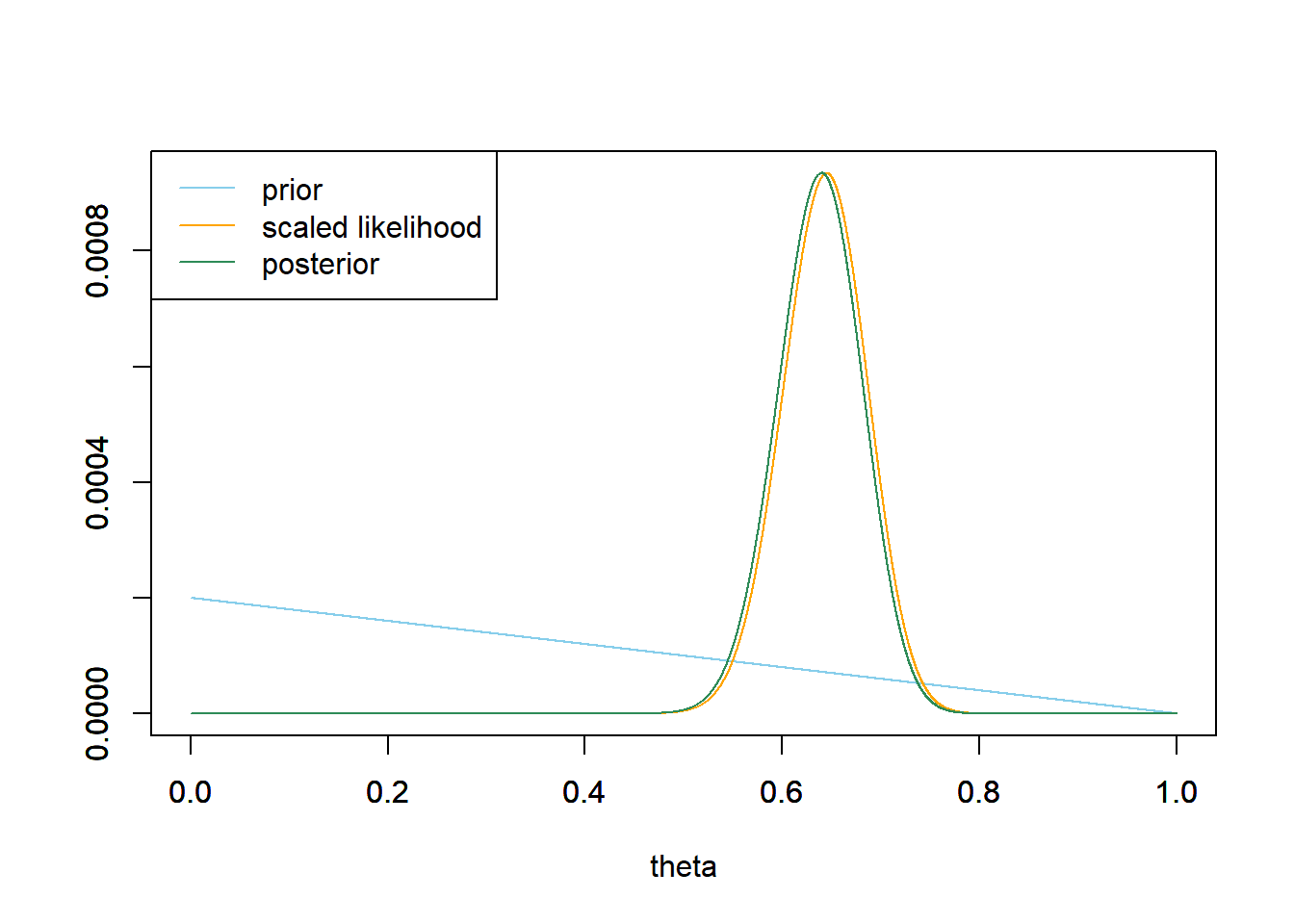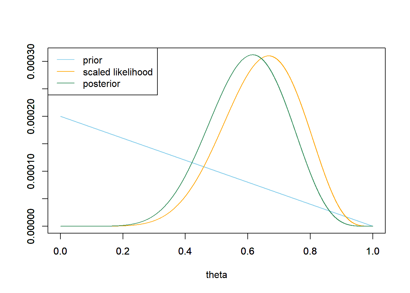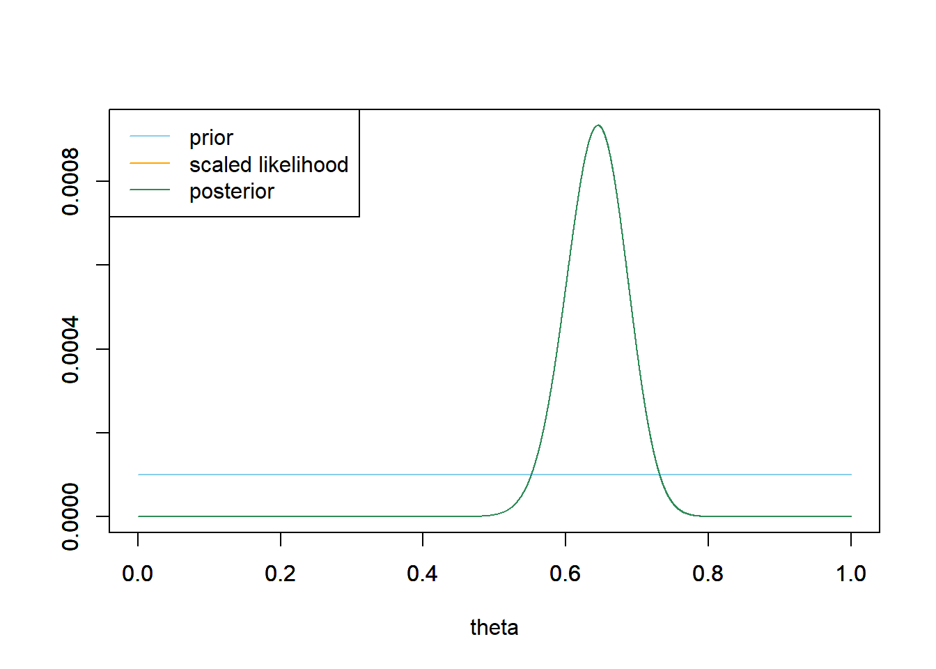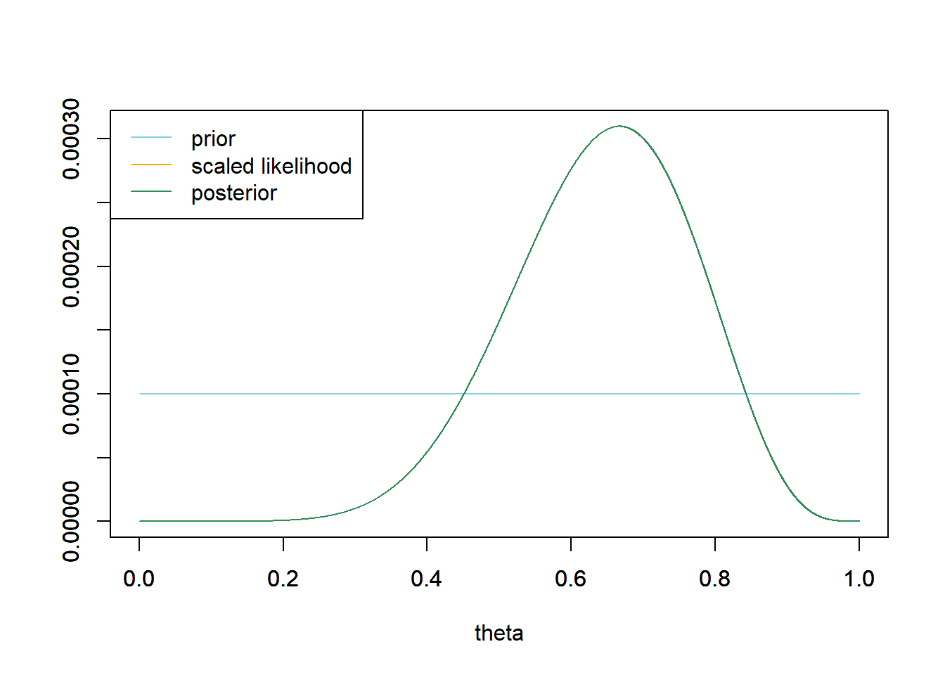 theta = seq(0, 1, 0.0001) # prior prior = rep(1, length(theta)) prior = prior / sum(prior) # data n = 12 # sample size y = 8 # sample count of success # likelihood, using binomial likelihood = dbinom(y, n, theta) # function of theta # plots plot_posterior <- function(theta, prior, likelihood){ # posterior product = likelihood * prior posterior = product / sum(product) ylim = c(0, max(c(prior, posterior, likelihood / sum(likelihood)))) plot(theta, prior, type='l', xlim=c(0, 1), ylim=ylim, col="skyblue", xlab='theta', ylab='') par(new=T) plot(theta, likelihood/sum(likelihood), type='l', xlim=c(0, 1), ylim=ylim, col="orange", xlab='', ylab='') par(new=T) plot(theta, posterior, type='l', xlim=c(0, 1), ylim=ylim, col="seagreen", xlab='', ylab='') legend("topleft", c("prior", "scaled likelihood", "posterior"), lty=1, col=c("skyblue", "orange", "seagreen")) } plot_posterior(theta, prior, likelihood)