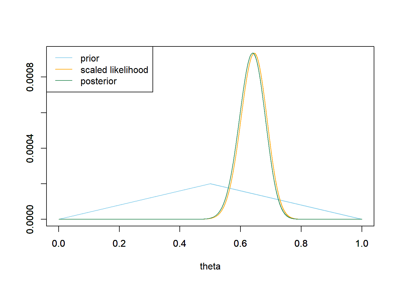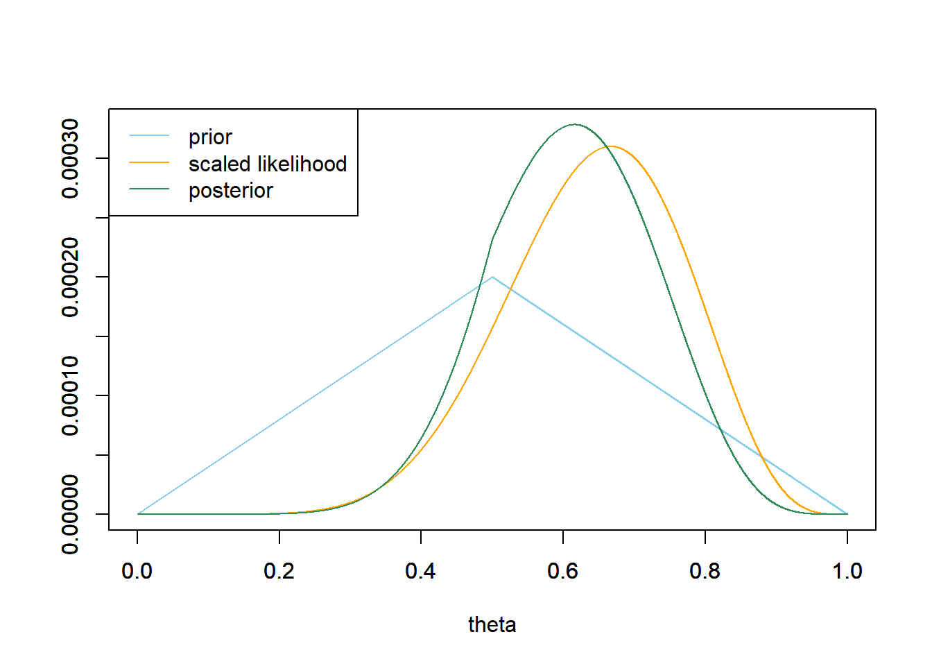 # prior theta = seq(0, 1, 0.0001) prior = 1 - 2 * abs(theta - 0.5) prior = prior / sum(prior) # data n = 12 # sample size y = 8 # sample count of success # likelihood, using binomial likelihood = dbinom(y, n, theta) # function of theta # plots plot_posterior(theta, prior, likelihood)