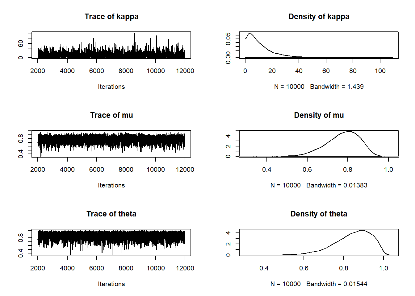 head(round(as.matrix(posterior_sample), 3))## kappa mu theta[1] theta[2] theta[3] theta[4] theta[5] theta[6]