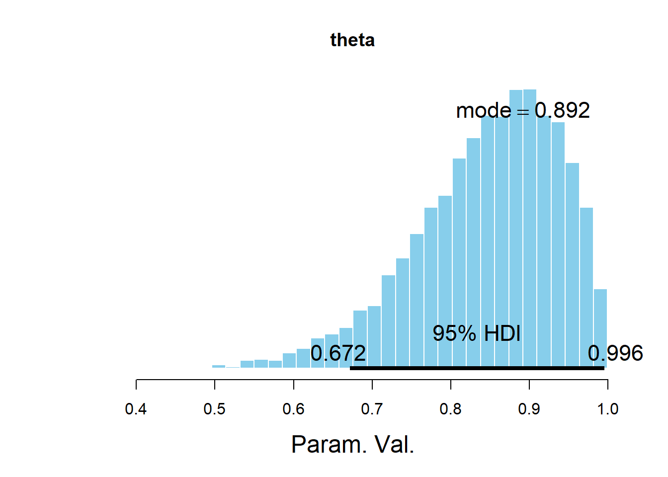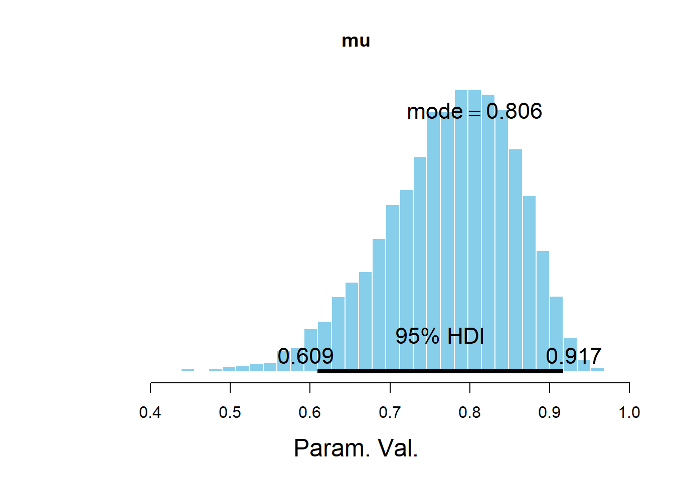 - Prior. \((\theta|\mu,\kappa)\sim\) Beta\((\mu\kappa, (1-\mu)\kappa)\).