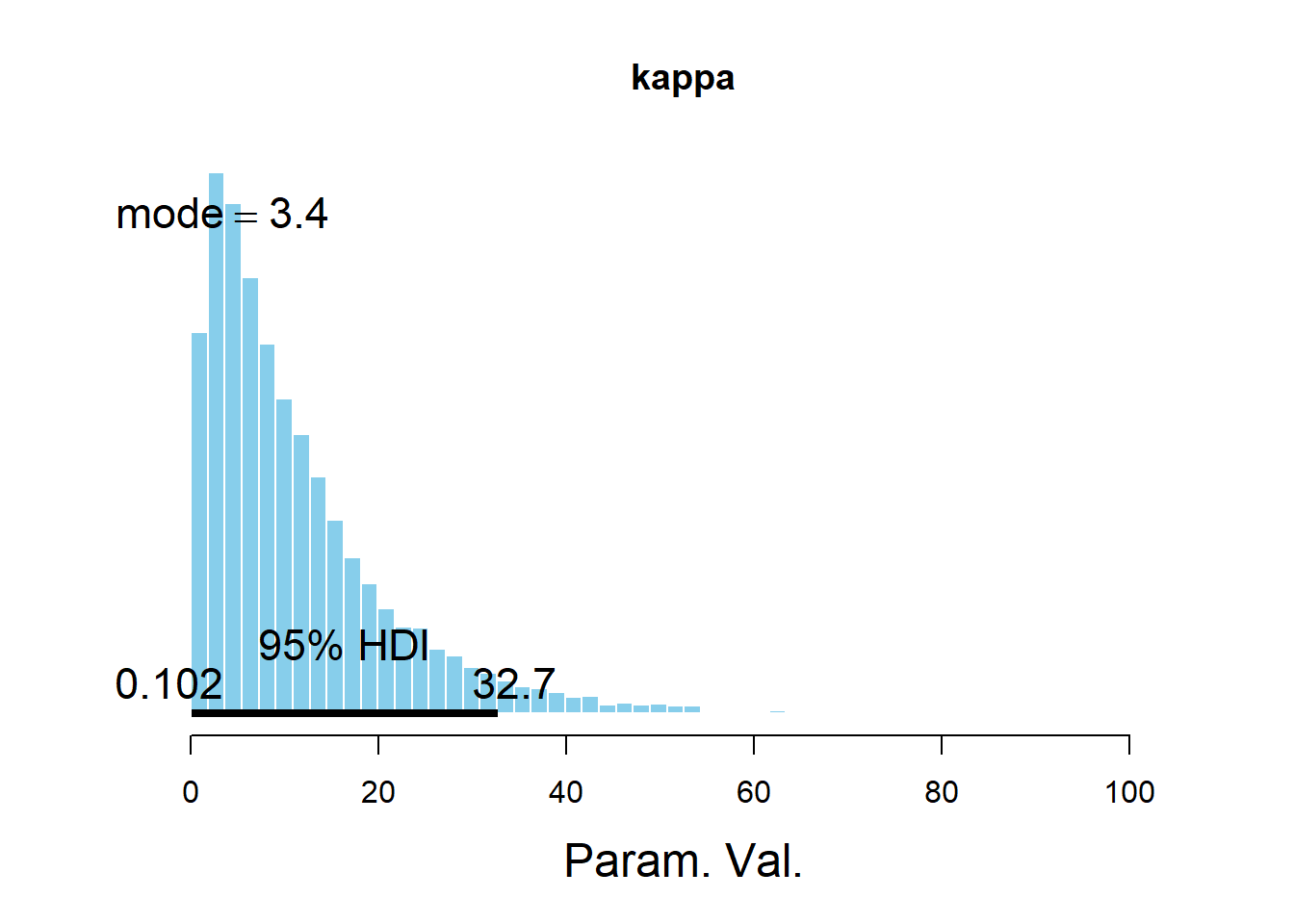 - \(\kappa\) represents the “equivalent prior sample size39” upon which our beliefs about \(\theta\) are based. Putting a prior on \(\kappa\) is like allowing for different degrees of strength for our prior beliefs about \(\theta\). (Alternatively, \(\kappa\) is inversely related to the variance of the prior distribution. So putting a prior on \(\kappa\) represents our uncertainty in the league-wide player-to-player variance in free throw percentages.) A Gamma(1, 0.1) prior40 has mean 10 and standard deviation 10. So we’re saying our prior beliefs about \(\theta\) are likely based on an “equivalent prior sample size” in the single digits or a few tens (but not hundreds or thousands) of pseudo-observations. This is like saying we haven’t observed any players, so we don’t have much information about the league-wide distribution or player-to-player variability of free throw percentages.
