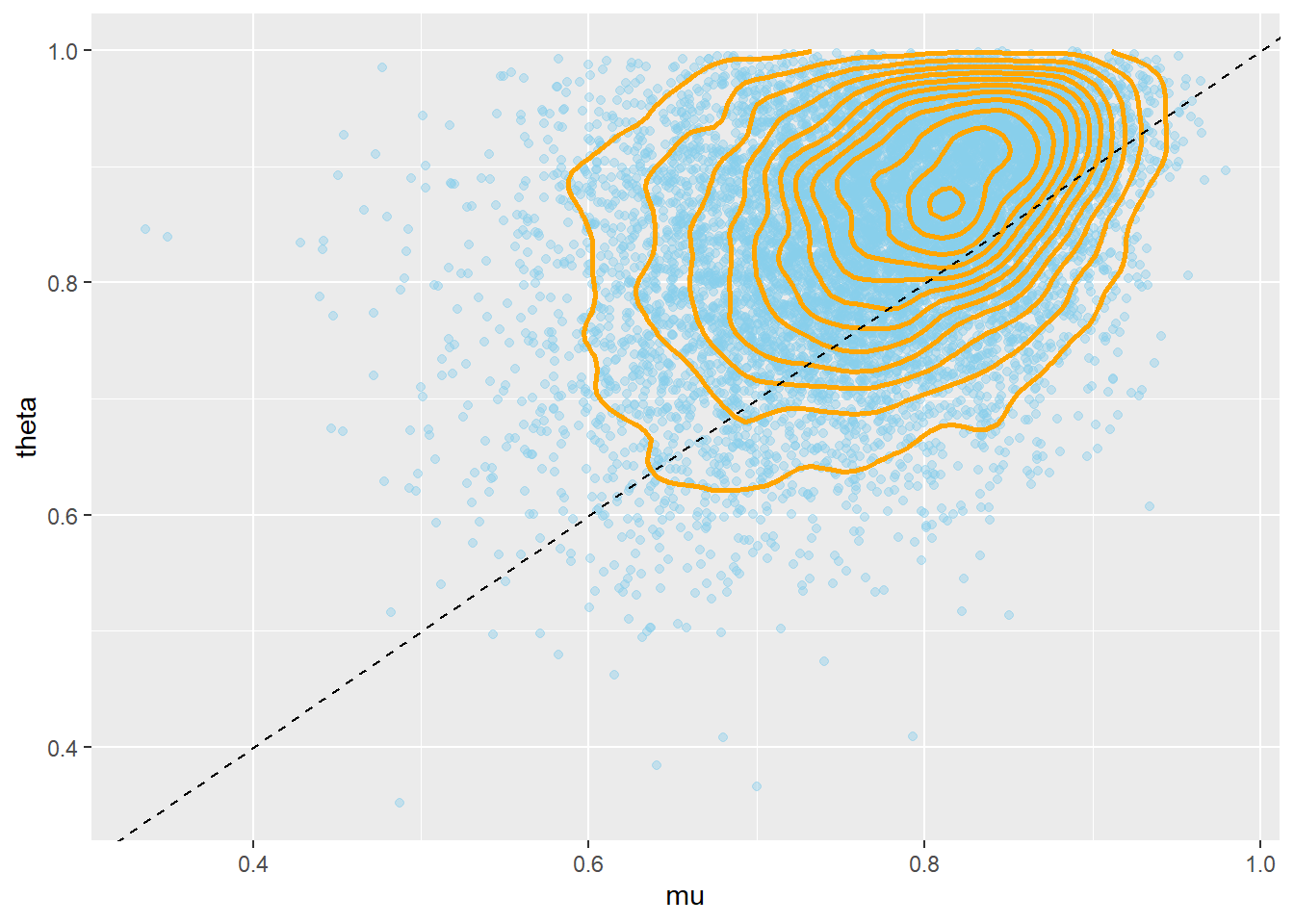 Remember that the posterior distribution is what’s important, but let’s first take a brief look at the prior. Notice the positive correlation between \(\mu\) and \(\theta\). Also notice that while conditional on \(\mu\) and \(\kappa\) the prior distribution of \(\theta\) is a Beta distribution, the marginal prior distribution of \(\theta\) is not a Beta distribution.