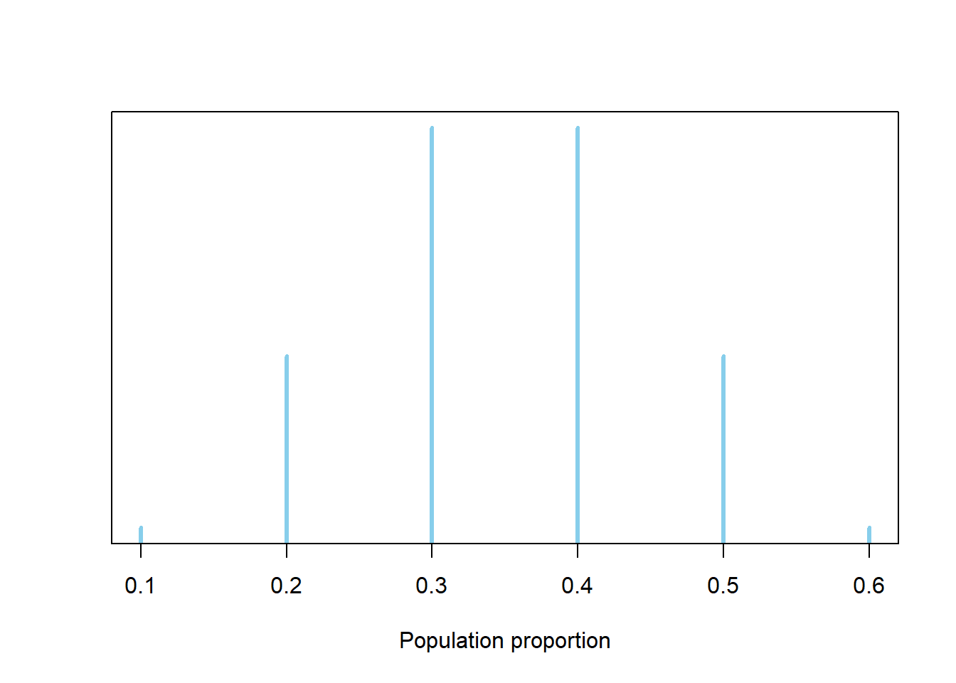 We’ll start by considering only the values 0.1, 0.2, 0.3, 0.4, 0.5, 0.6 as initially plausible for the population proportion \(\theta\). Suppose that before collecting sample data, our prior assessment is that: