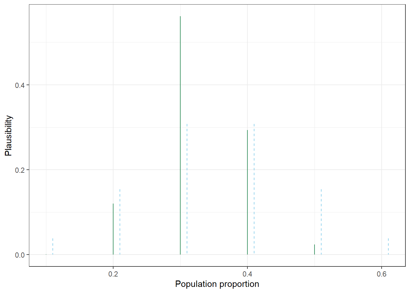 Population proportion Prior “Units” Prior Number of reps Likelihood of count of 9 Reps with count of 9 Posterior 0.1 1 0.0385 10000 0.0016 16 0.0007 0.2 4 0.1538 40000 0.0676 2703 0.1205 0.3 8 0.3077 80000 0.1573 12583 0.5612 0.4 8 0.3077 80000 0.0823 6582 0.2935 0.5 4 0.1538 40000 0.0133 533 0.0238 0.6 1 0.0385 10000 0.0006 6 0.0003 Total 26 1.0000 260000 0.3227 22423 1.0000 The plot below compares our prior plausibility (blue) and our posterior plausibility (green) after observing the data. The values 0.3 and 0.4 initially were equally plausible for \(\theta\), but after observing a sample proportion of 0.3 the value 0.3 is now almost 2 times more plauible than a value of 0.4. The values 0.2, 0.3, 0.4 together accounted for about 77% of our initial plausibility, but after observing the data these three values now account for over 97% of our plausibility.