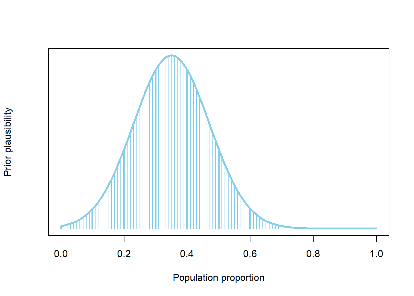 In the example below we’ll start with an assessment of plausibility. We’ll discuss later how you might obtain such an assessment. For now, focus on the big picture: we start with some initial assessment of plausibility before observing data, and we want to update that assessment upon observing some data.
