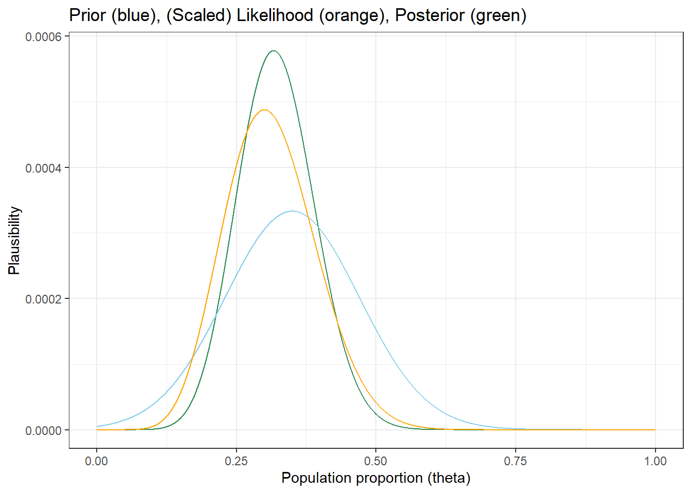 # Possible values of theta theta = seq(0, 1, 0.0001) # Prior distribution # Smoothly connect the dots using a Normal distribution # Then rescale to sum to 1 prior = dnorm(theta, 0.35, 0.12) # prior "units" - relative values prior = prior / sum(prior) # recale to sum to 1 # Likelihood # Likelihood of observing sample count of 9 out of 30 # for each theta likelihood = dbinom(9, 30, theta) # Posterior # Product gives relative posterior plausibilities # Then rescale to sum to 1 product = prior * likelihood posterior = product / sum(product) # Put the columns together bayes_table = data.frame(theta, prior, likelihood, product, posterior) # Display a portion of the table bayes_table %>% slice(seq(2001, 4001, 250)) %>% # selects a few rows to display kable(digits = 8)theta prior likelihood product posterior 0.200 0.0001525 0.06756 0.00001030 0.0001204 0.225 0.0001936 0.10012 0.00001938 0.0002265 0.250 0.0002353 0.12981 0.00003055 0.0003570 0.275 0.0002740 0.15019 0.00004115 0.0004808 0.300 0.0003054 0.15729 0.00004803 0.0005613 0.325 0.0003259 0.15062 0.00004909 0.0005736 0.350 0.0003330 0.13285 0.00004424 0.0005170 0.375 0.0003259 0.10847 0.00003535 0.0004131 0.400 0.0003054 0.08228 0.00002512 0.0002936 The plot below displays the prior, likelihood1, and posterior. Notice that the likehood of the observed data is highest for \(\theta\) near 0.3, so our plausibility has “moved” in the direction of \(\theta\) near 0.3 after observing the data.