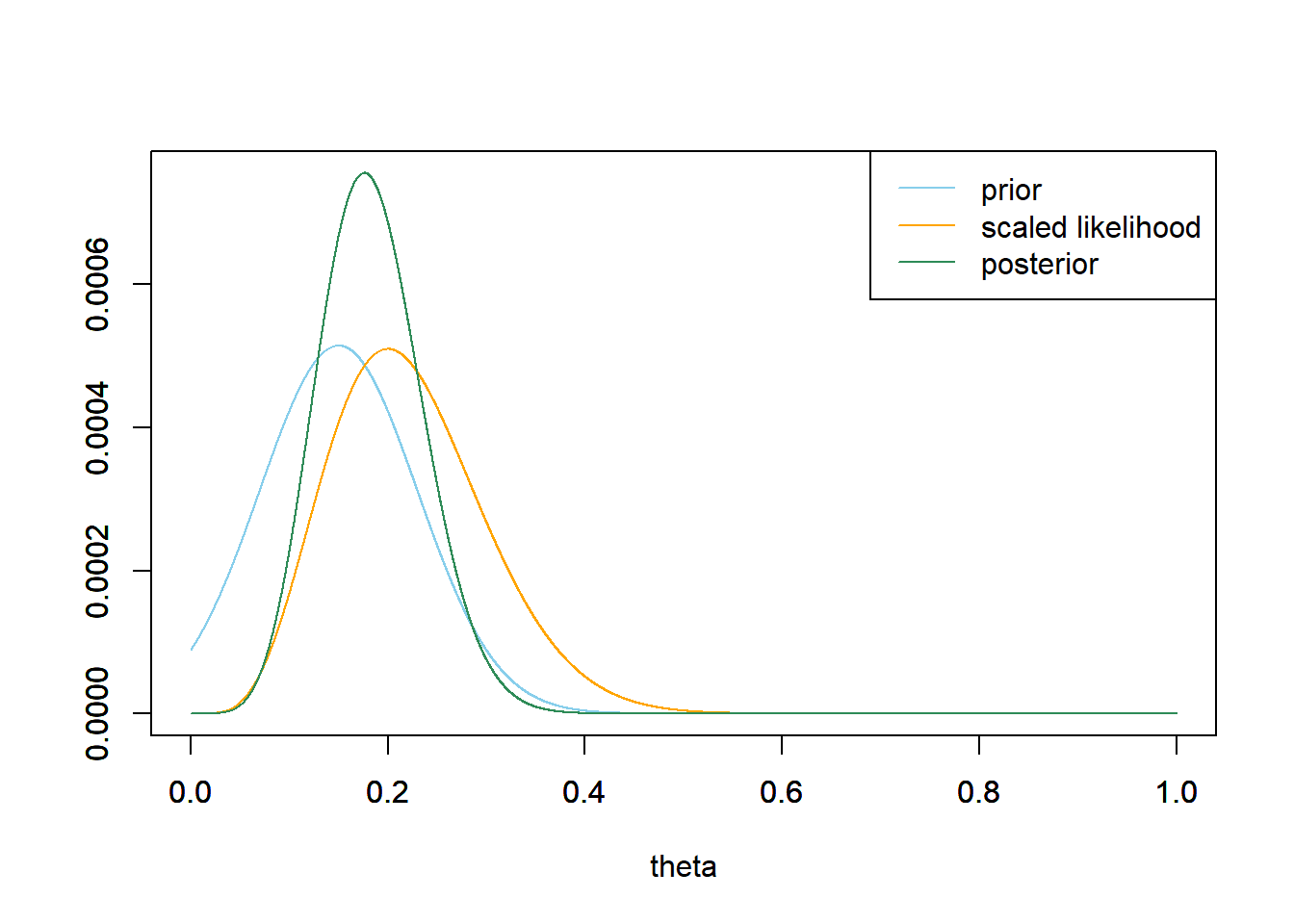 legend("topright", c("prior", "scaled likelihood", "posterior"), lty=1, col=c("skyblue", "orange", "seagreen"))