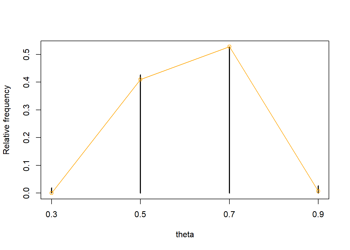 n_sim = 100000 theta_prior_sim = sample(c(0.1, 0.3, 0.5, 0.7, 0.9), size = n_sim, replace = TRUE, prob = c(1, 2, 3, 2, 1) / 9) y_sim = rbinom(n_sim, 12, theta_prior_sim) kable(head(data.frame(theta_prior_sim, y_sim), 20))theta_prior_sim y_sim 0.1 0 0.5 2 0.5 5 0.7 10 0.1 2 0.5 6 0.5 8 0.1 1 0.7 7 0.5 7 0.7 10 0.3 3 0.5 5 0.5 7 0.9 11 0.7 12 0.3 6 0.5 8 0.3 5 0.9 10 theta_post_sim = theta_prior_sim[y_sim == 8] table(theta_post_sim)## theta_post_sim ## 0.3 0.5 0.7 0.9 ## 177 4070 5031 253plot(table(theta_post_sim) / length(theta_post_sim), xlab = "theta", ylab = "Relative frequency") # true posterior for comparison par(new = T) plot(c(0.3, 0.5, 0.7, 0.9), c(0.0181, 0.4207, 0.5365, 0.0247), col = "orange", type = "o", xaxt = 'n', yaxt = 'n', xlab = "", ylab = "")