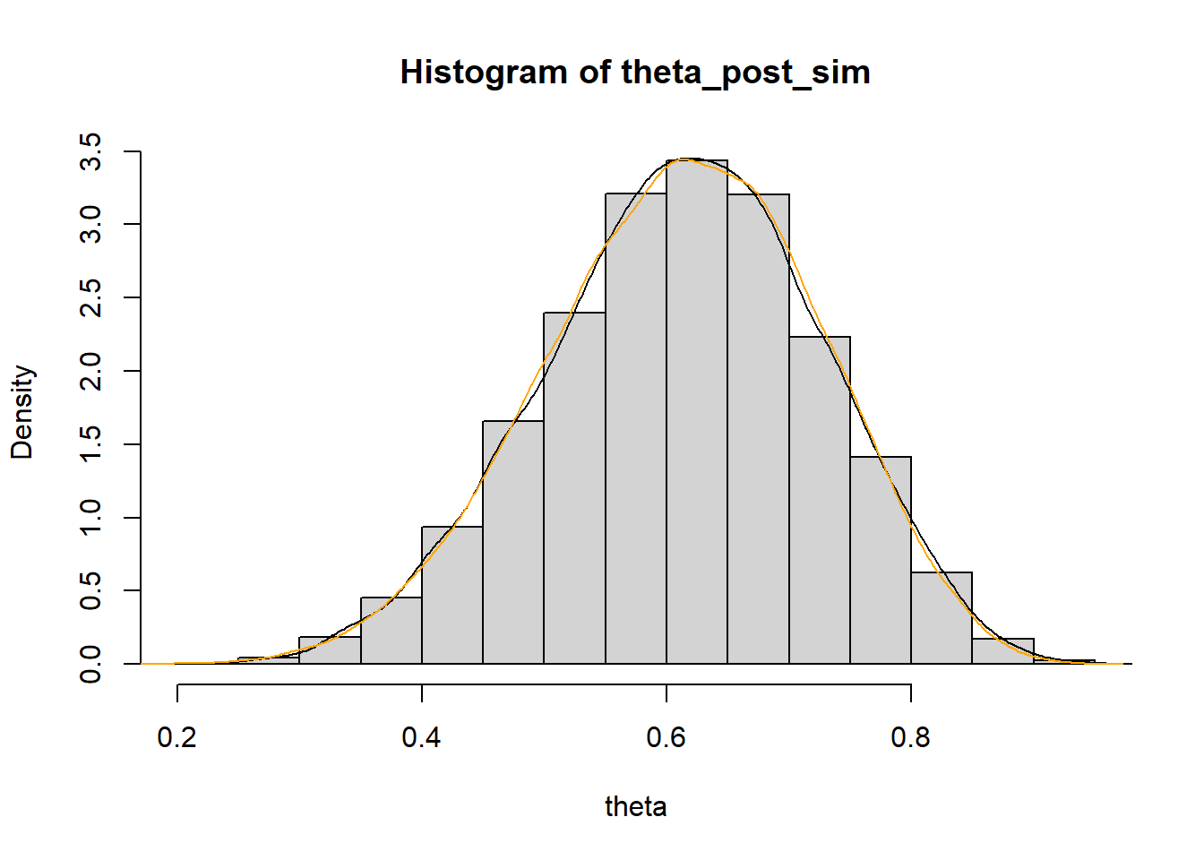 rbeta). Now any value between 0 and 1 is a possible value of \(\theta\). But we would still approximate the posterior distribution by discarding any \((\theta, Y)\) pairs for which \(Y\) is not equal to 8. Since \(\theta\) is continuous, we could summarize the simulated values with a histogram or density plot.n_sim = 100000 theta_prior_sim = rbeta(n_sim, 3, 3) y_sim = rbinom(n_sim, 12, theta_prior_sim) kable(head(data.frame(theta_prior_sim, y_sim), 20))theta_prior_sim y_sim 0.4965 6 0.3985 6 0.4446 6 0.4233 7 0.4427 5 0.5821 6 0.1518 4 0.6136 6 0.7128 6 0.3245 5 0.7393 8 0.3007 4 0.9726 12 0.3001 3 0.2044 1 0.3401 2 0.6289 6 0.7696 11 0.7605 10 0.3823 4 theta_post_sim = theta_prior_sim[y_sim == 8] hist(theta_post_sim, freq = FALSE, xlab = "theta", ylab = "Density") lines(density(theta_post_sim)) # true posterior for comparison lines(density(rbeta(100000, 3 + 8, 3 + 4)), col = "orange")