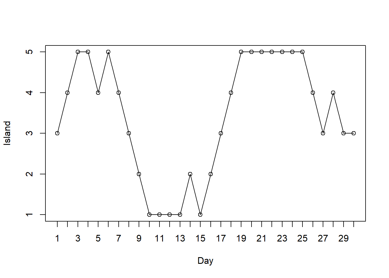 If she is on island 1 and she proposes a move to the west, the proposal is rejected (because the population of island “0” is 0) and she spends another day on island 1. Likewise if she proposes a move to the east from island 5.