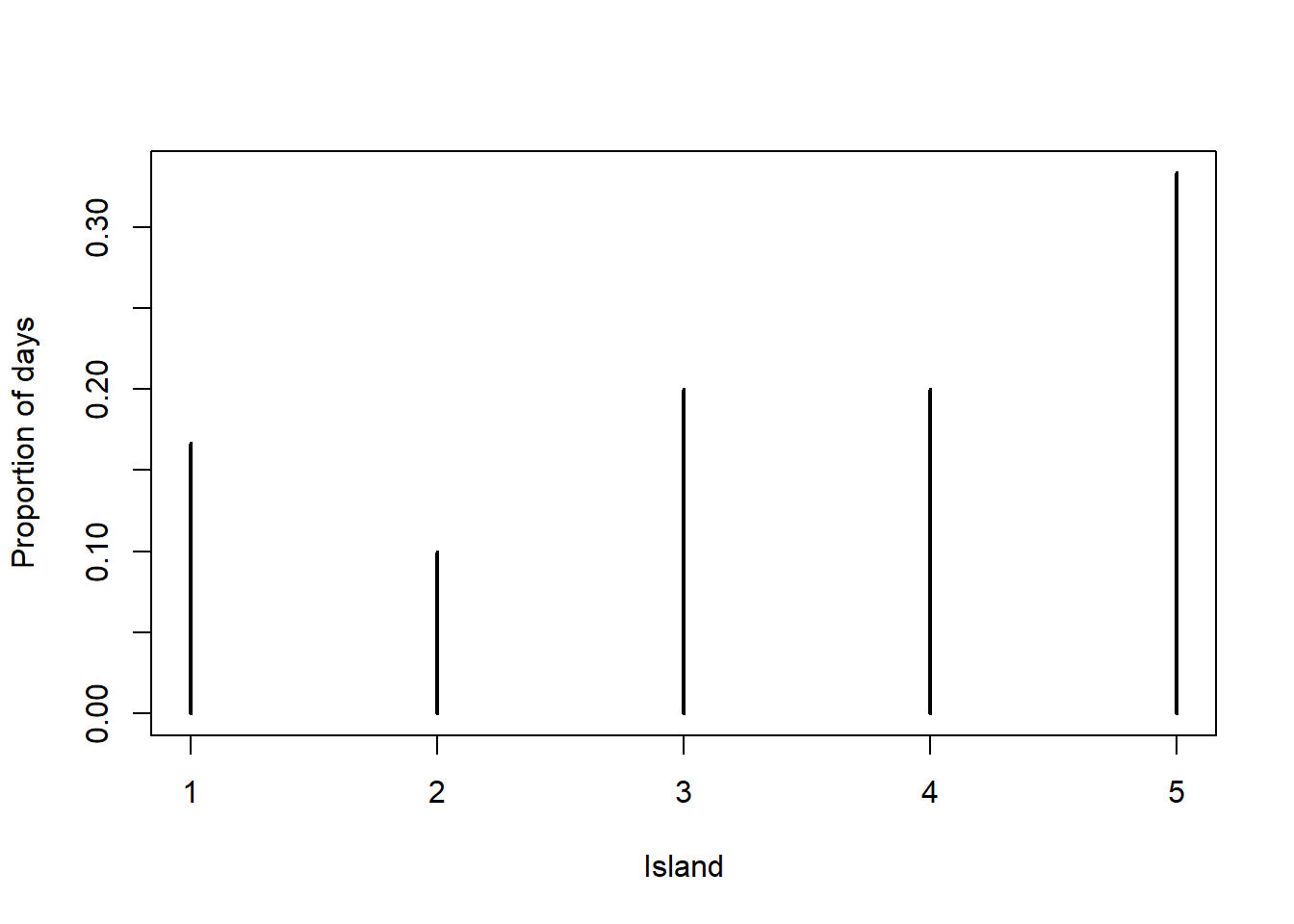 Construct by hand a plot displaying the simulated relative frequencies of days in each of the 5 islands.