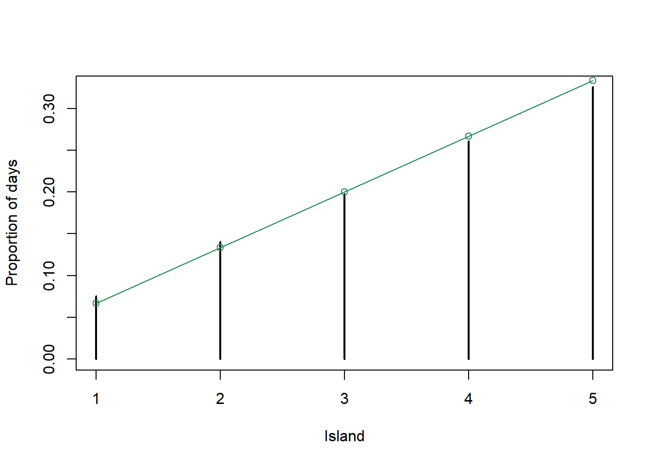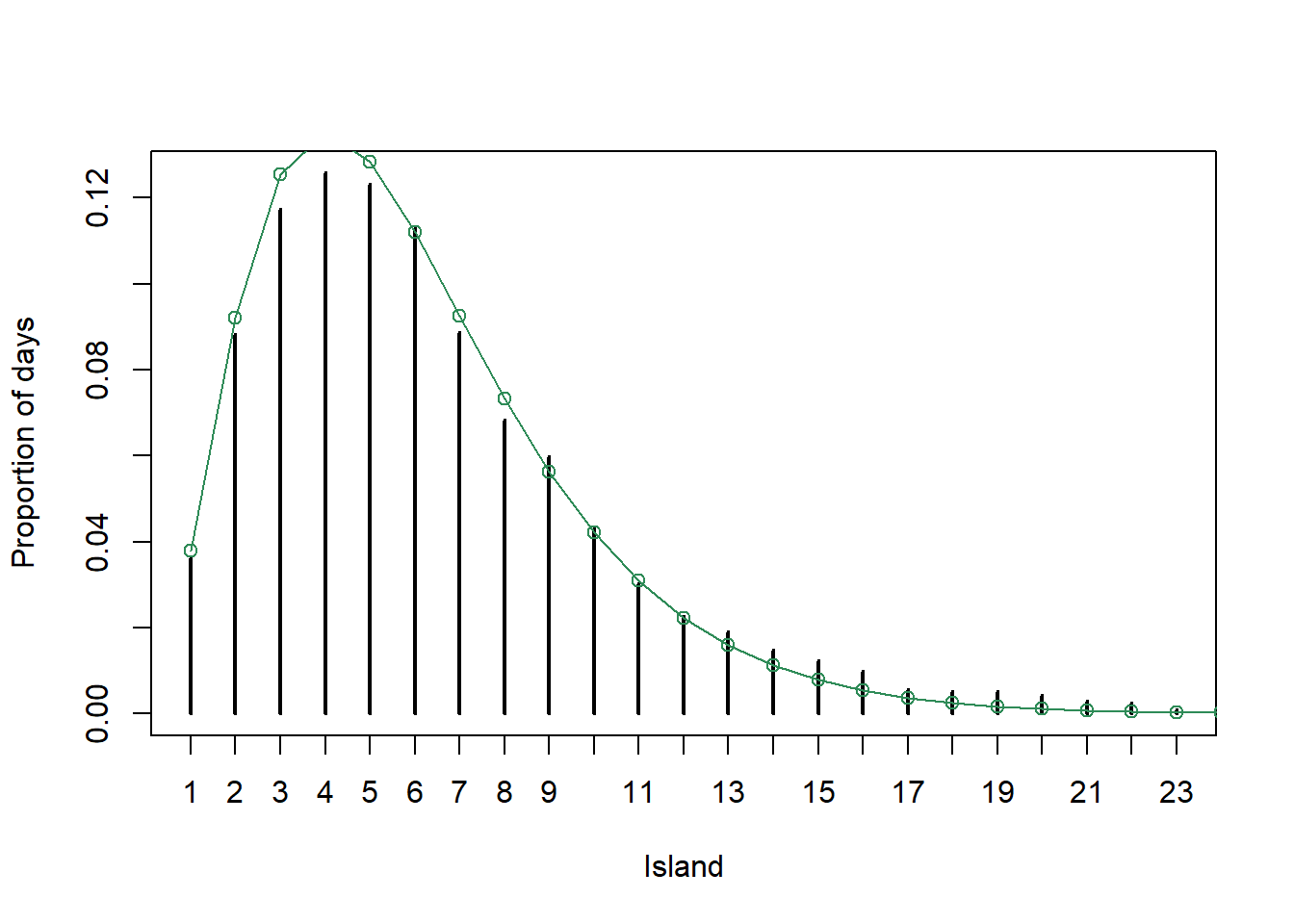plot(table(theta_sim) / n_steps, xlab = "Island", ylab = "Proportion of days") points(theta, theta / 15, type = "o", col = "seagreen")