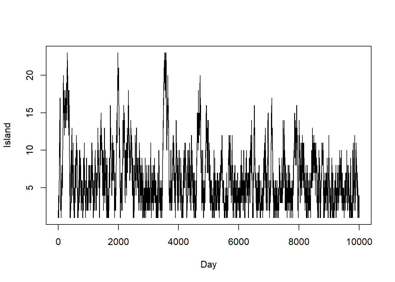 n_states = 30 theta = 1:n_states pi_theta = theta ^ 2 * exp(-0.5 * theta) # notice: not probabilities n_steps = 10000 theta_sim = rep(NA, n_steps) theta_sim[1] = 1 # initialize for (i in 2:n_steps){ current = theta_sim[i - 1] proposed = sample(c(current + 1, current - 1), size = 1, prob = c(0.5, 0.5)) if (!(proposed %in% theta)){ # to correct for proposing moves outside of boundaries proposed = current } a = min(1, pi_theta[proposed] / pi_theta[current]) theta_sim[i] = sample(c(proposed, current), size = 1, prob = c(a, 1-a)) } # trace plot plot(1:n_steps, theta_sim, type = "l", ylim = range(theta_sim), xlab = "Day", ylab = "Island")
