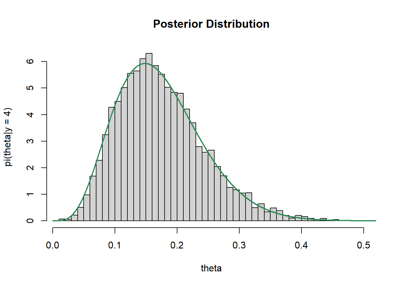 The theoretical posterior distribution is the Beta(5, 24) distribution, depicted in green above. The distribution of simulated values of \(\theta\) provides a reasonable approximation to the posterior distribution.