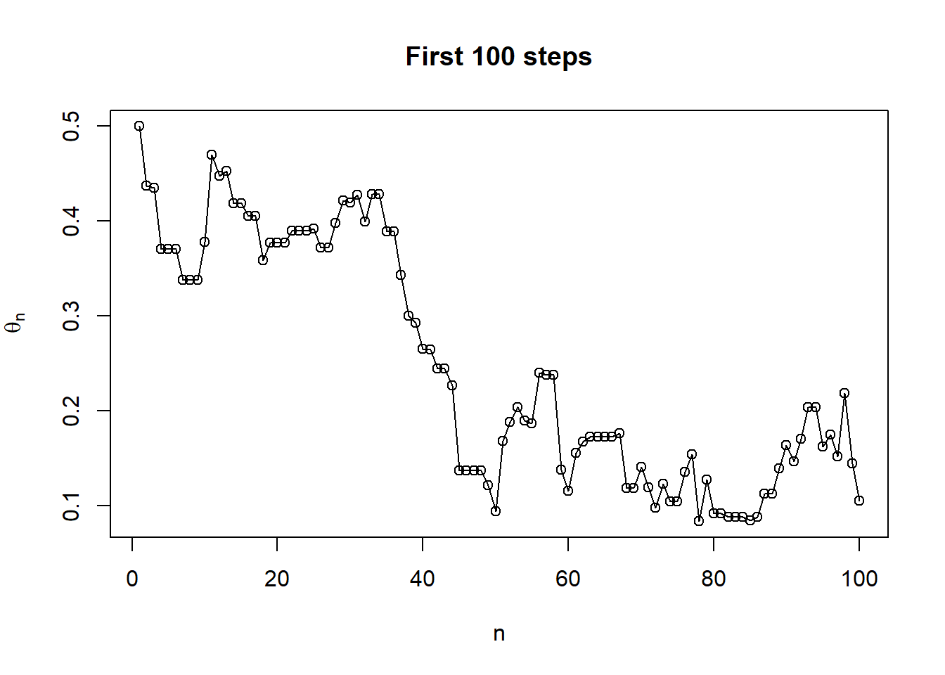 plot(1:100, theta[1:100], type = "o", xlab = "n", ylab = expression(theta[n]), main = "First 100 steps")