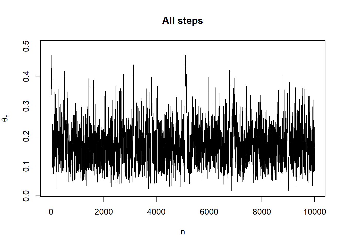 plot(1:n_steps, theta, type = "l", xlab = "n", ylab = expression(theta[n]), main = "All steps")